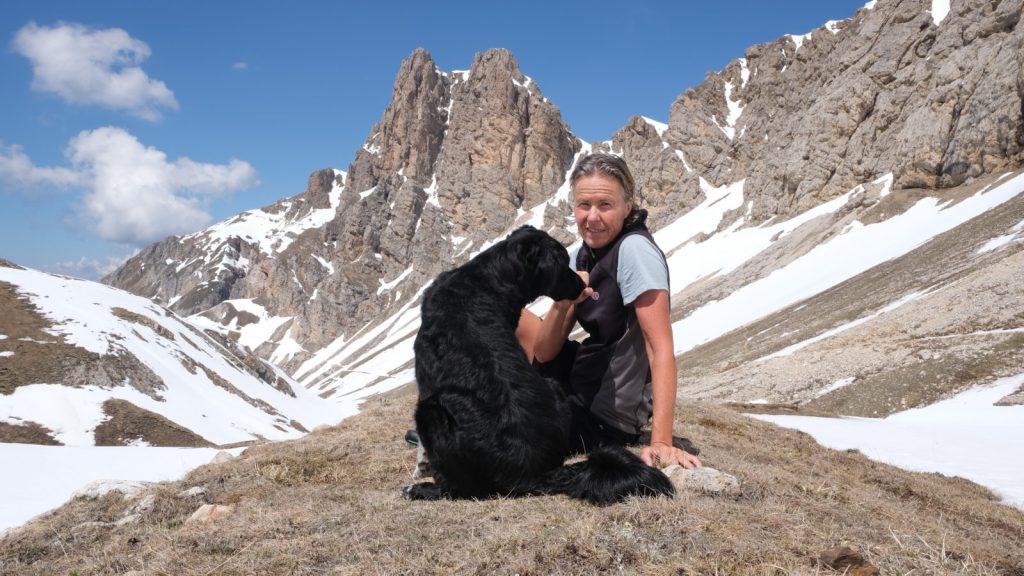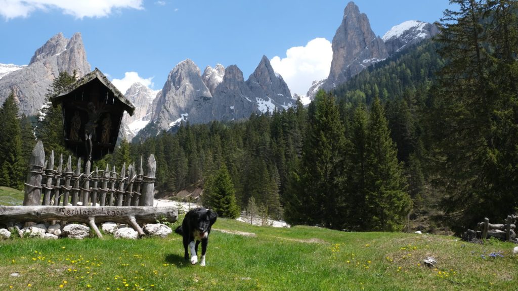 Die mit Abstand anspruchsvollste Unternehmung des Kurztripps bescherte der letzte Tag. Von Weißlahnbad, einem kleinen Weiler bei Tiers, brachen wir auf durch das wunderschöne, lange Tschamintal. Die Dolomitenzacken stets vor Augen fragt sich der Wanderer, wo dort in der Sackgasse ein Durchschlupf sein soll. Bärenloch heißt eben dieser und führt zwischen steilen Dolomitenwänden hinauf zur Tierser Alplhütte. Schon nach recht kurzer Wegstrecke habe ich den Anhänger im Wald versteckt, denn es machte auf der Rüttelpiste keinen Sinn, ihn hinterher zu ziehen. Eine Abfahrt hätte Napoli zu sehr durchgeschüttelt.