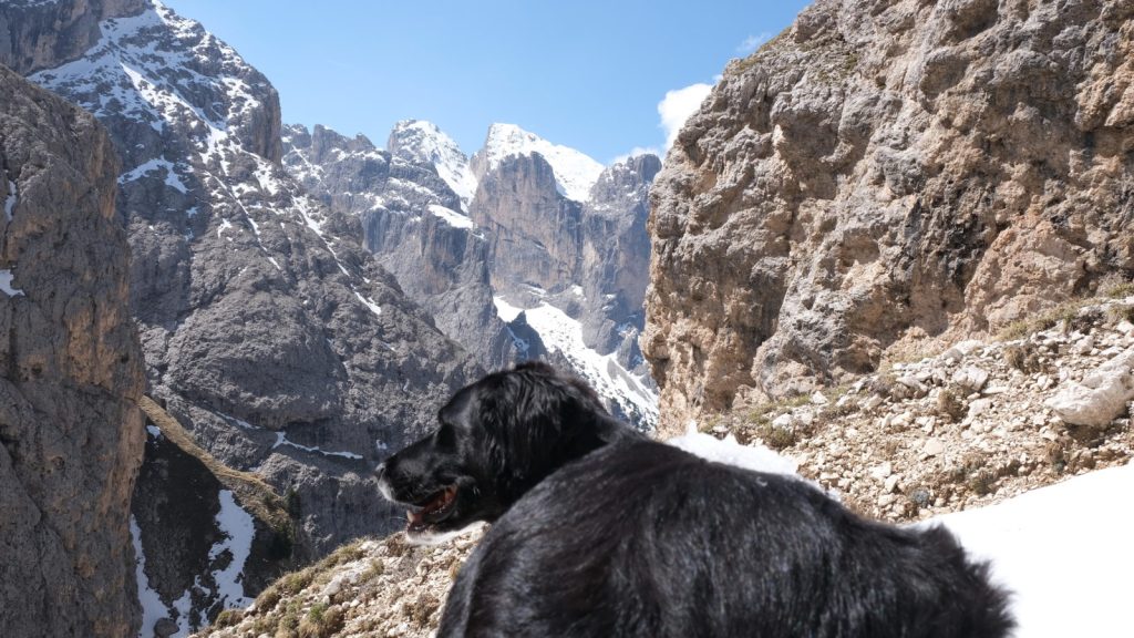Man könnte einen anderen Abstieg von der Alplhütte wählen, doch ob der ausreichend schneefrei wäre? Ich würde es sehen. Zunächst konnte ich mir gar nicht vorstellen, zwischen den Felstürmen überhaupt hinauf steigen zu können. Immer spannender wurde der Aufstieg, bis oben hinaus ein Trichter voller Schnee mich überlegen ließ. Sollte ich es wagen, oder war es zu lawinengefährlich? Nach hinreichender Begutachtung der Passage entschied ich mich für eine Umgehung, die mir machbar und sicher erschien. Und Bingo. Kurze Zeit später standen wir in der grellweißen Schneefläche unterhalb des Schlernmassivs. Der Rundweg war leider aufgrund der gewaltigen Schneemengen nicht machbar. Der steht noch auf unserer To-do-Liste.