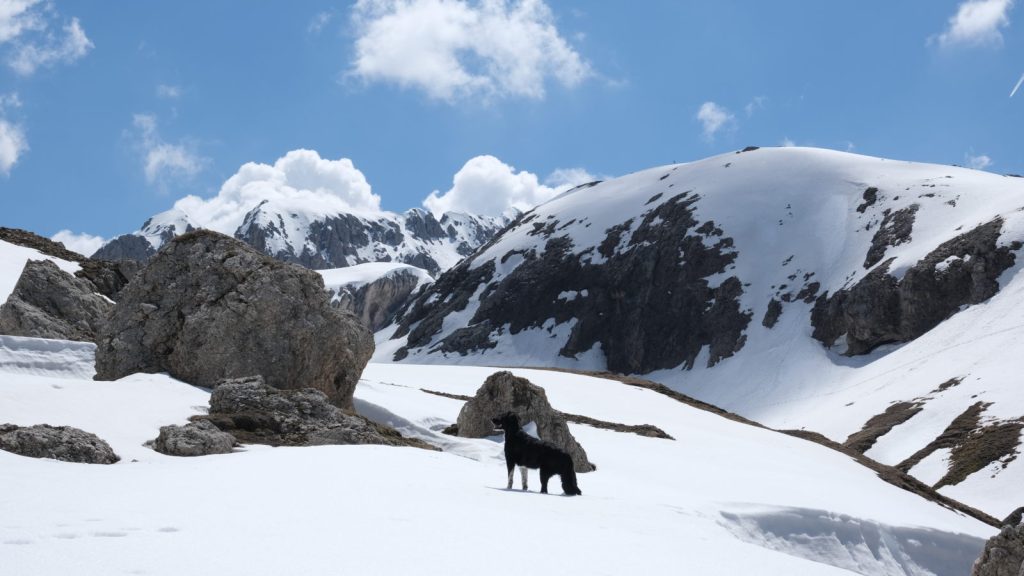 Auf der Suche nach einem Sternenlogenplatz für die zweite Nacht, spülte es uns ein Stück den Rollepass hoch. Und so ergab sich ein fantastischer Tag bei Bellamonte. Skigebiete außerhalb der Saison sorgen nicht nur für optische Unbill, finde ich. Nach ihrer Schließung auf dem gut komprimierten Schnee der Pisten zu wandern hat auch etwas für sich. Von den manchmal entlegenen Parkplätzen, auf denen man zur Nebensaison wenig Camper trifft, ganz zu schweigen.