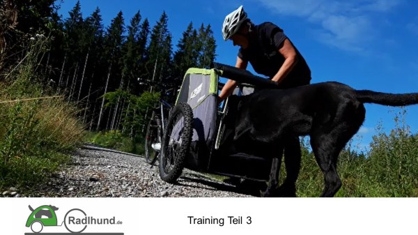 Im dritten Video geht es darum, endlich auf Tour zu gehen. Auch wenn der Hund den Hundeanhänger indoor als Ruheplatz völlig akzeptiert hat, kann das draußen ganz anders aussehen.