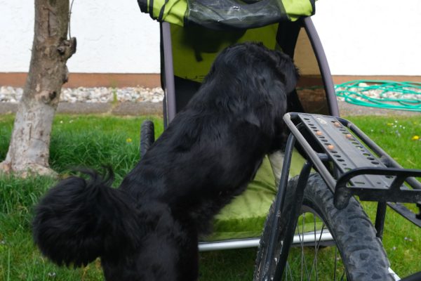 Die Sache war sehr haltbar und hatte den Vorteil, dass Napoli hinten rein und raus konnte. Vorne lassen sich dann fixe Stopper befestigen, so dass der Hund im Fall einer abrupten Bremsung gut geschützt ist. Nachteil: das Verdeck ist hinten nicht mehr lang genug. - Man lässt das hintere Textil im Originalzustand. Habe ich im Burley Minnow probiert. Napoli steigt vorne ein und aus, was sehr gut geht. Das Verdeck passt. Nachteil ist, dass ich die vorderen Stopper immer öffnen und schließen muss. Man könnte alternativ den Hund (kurz genug!) innen anleinen. Obwohl ich nicht unbedingt Freund davon bin, den Hund im Anhänger zu fixieren, bietet sich die obere Stange des Burley kombiniert mit entsprechendem Geschirr und zum Beispiel einer Bandschlinge und eines Karabiners aus dem Klettersport dafür gut an.