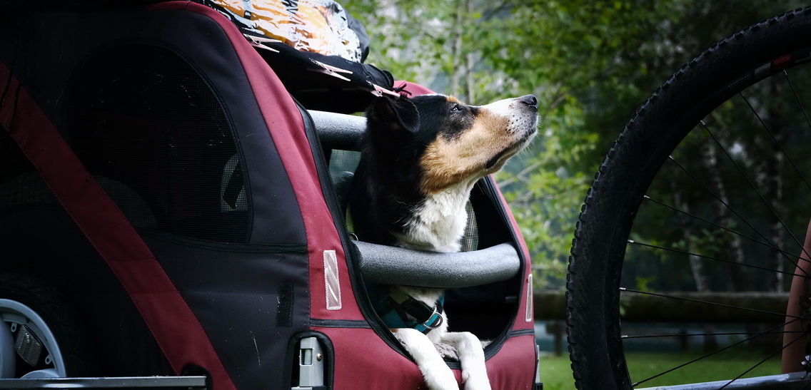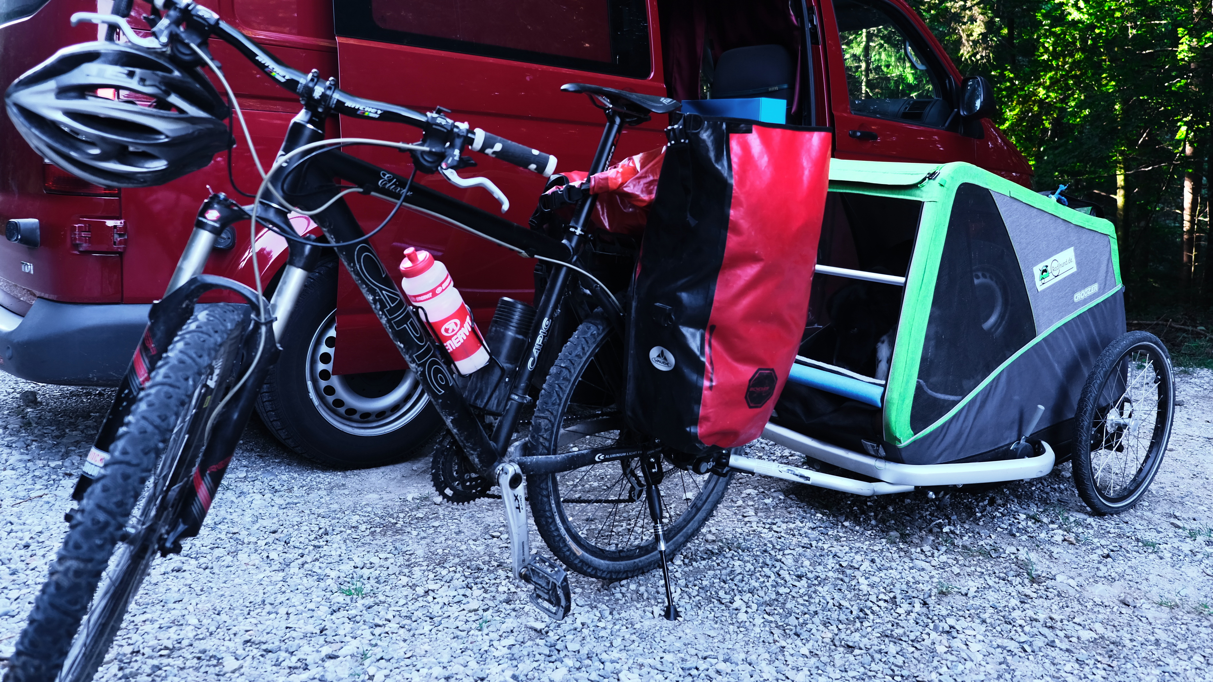 Radreise mit Hund im Anhänger, Zelt und Zeug