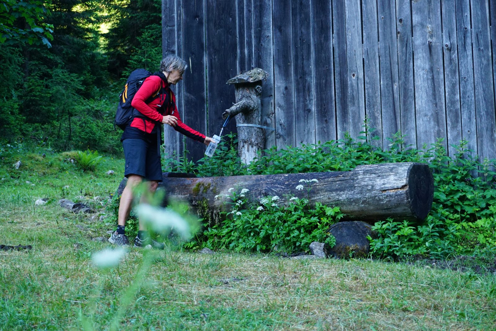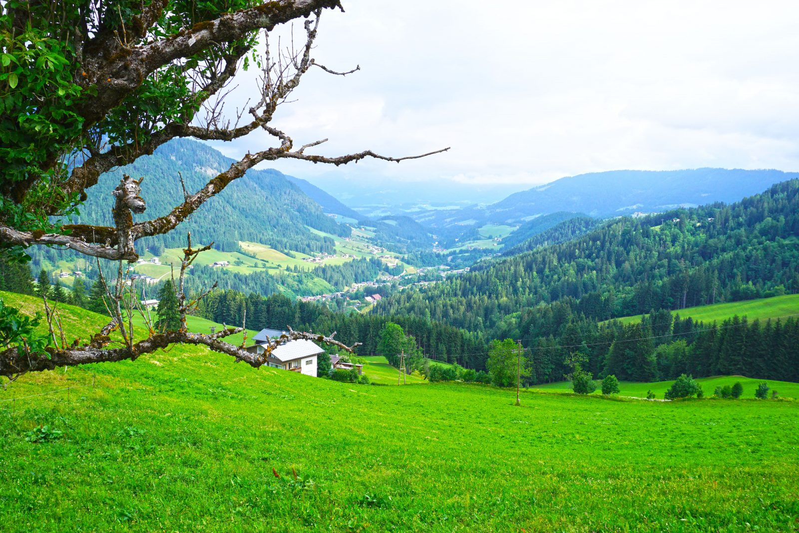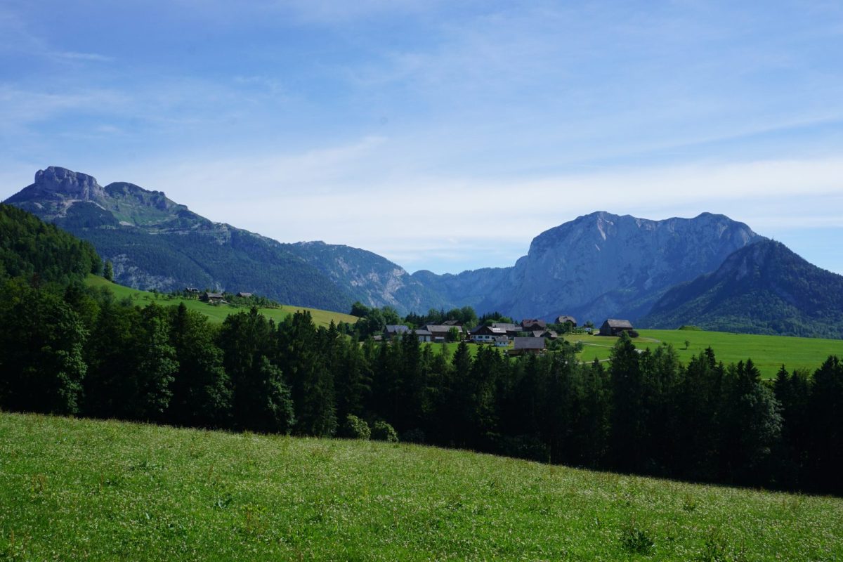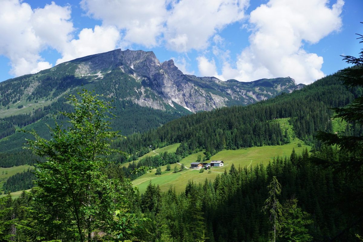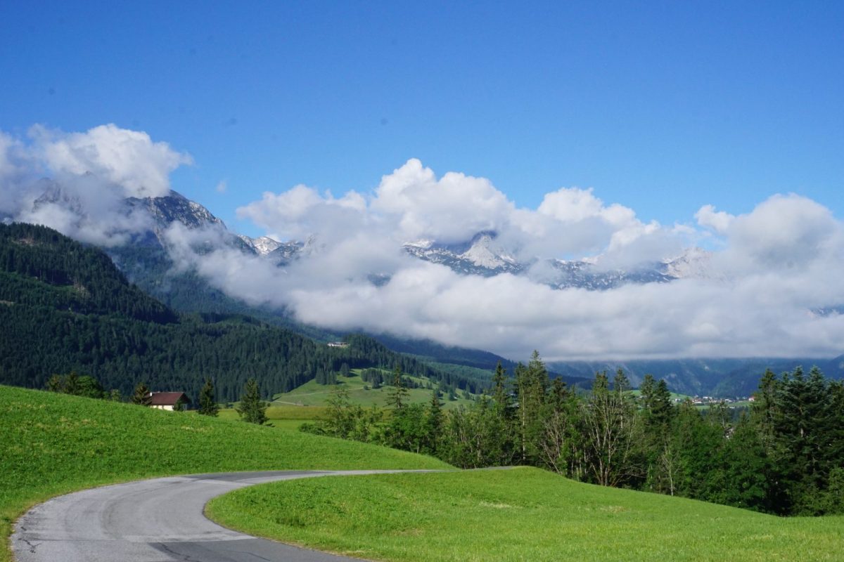Jawoll, der letzte Tag war eine halbe Tagesetappe! Ich hatte die Tageskilometer nicht so genau im Kopf, doch anhand der Karte meinte ich, zum Abschluss noch einmal ordentlich gefordert zu werden. Pustekuchen. In stetigem Auf und Ab durchquerten wir Wälder. Nur zu Anfang bot sich ein vielversprechender Blick auf die Bischofsmütze, den doppelhöckrigen Gipfel über Filzmoos. Doch dann führte die Strecke ohne weitere Aussicht am Gebirgsstock vorbei.
