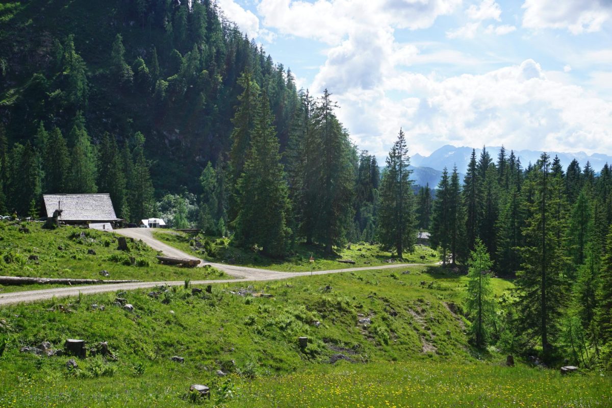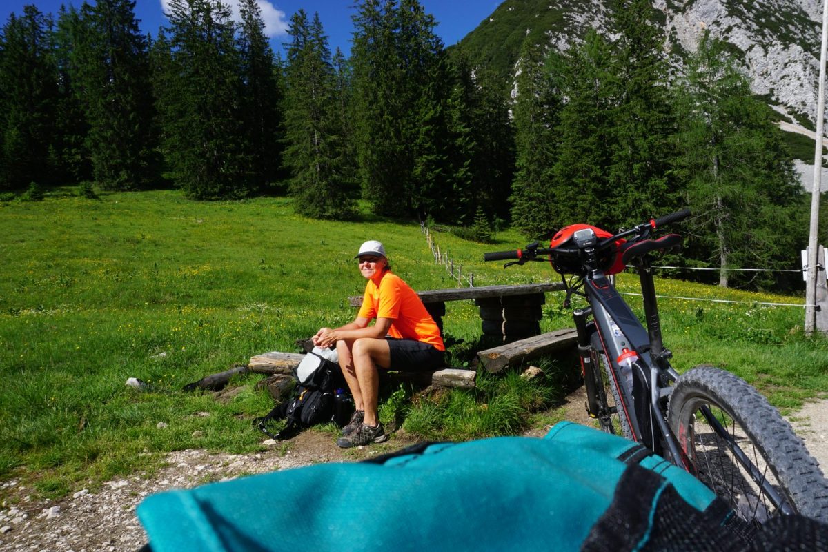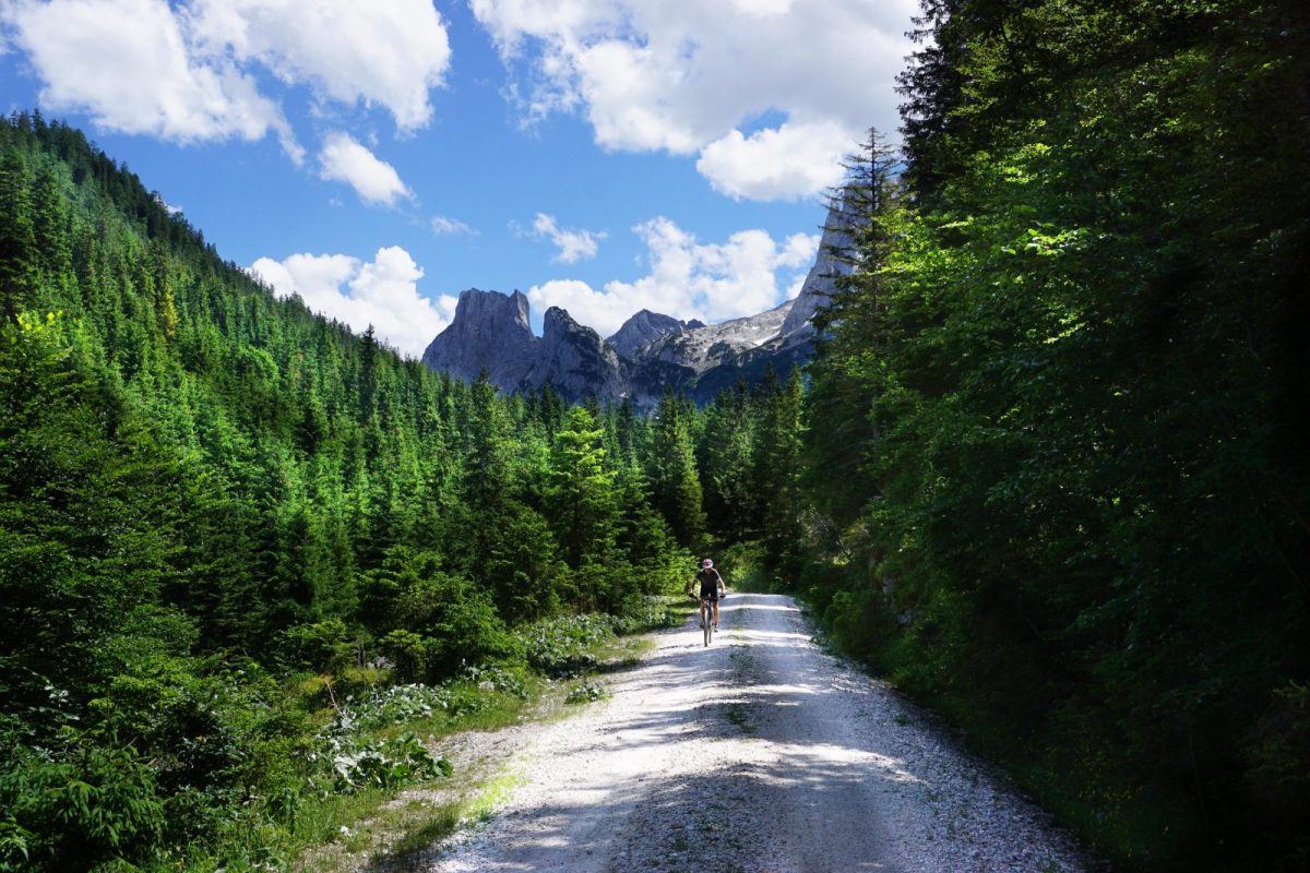 Die weitere Strecke bis zum nächsten Etappenziel Bad Mitterndorf verlief über beste Forststraßen mit ein paar kernigen Rampen, wenig aussichtsreich und somit recht langweilig. Die leichte Version der Dachstein Runde führt übrigens hauptsächlich über Forststraßen, die meist glatt sind, wie ein Babypopo. Mit Anhänger ist wirklich alles gut fahrbar. Während ich so vor mich hin radelte, sinnierte ich, für wen sich die Umrundung des Dachstein gut eignet. Ich denke, sie macht Radlern Spaß, die gern abseits von Straßen unterwegs sind, doch keine technischen Herausforderungen suchen. Auch für Familien kann ich mir die Unternehmung spannend vorstellen. Wenn jeder selbst radelt, braucht man keine eBikes und damit wäre wildes Zelten möglich. Ende Juni habe ich auf der gesamten Strecke jedenfalls kaum Etappenfahrer getroffen, was ich verwunderlich fand.