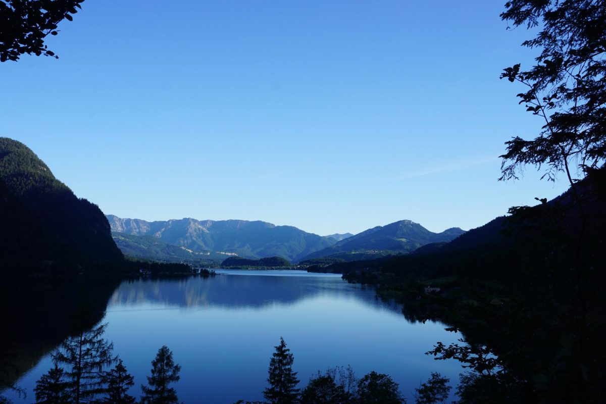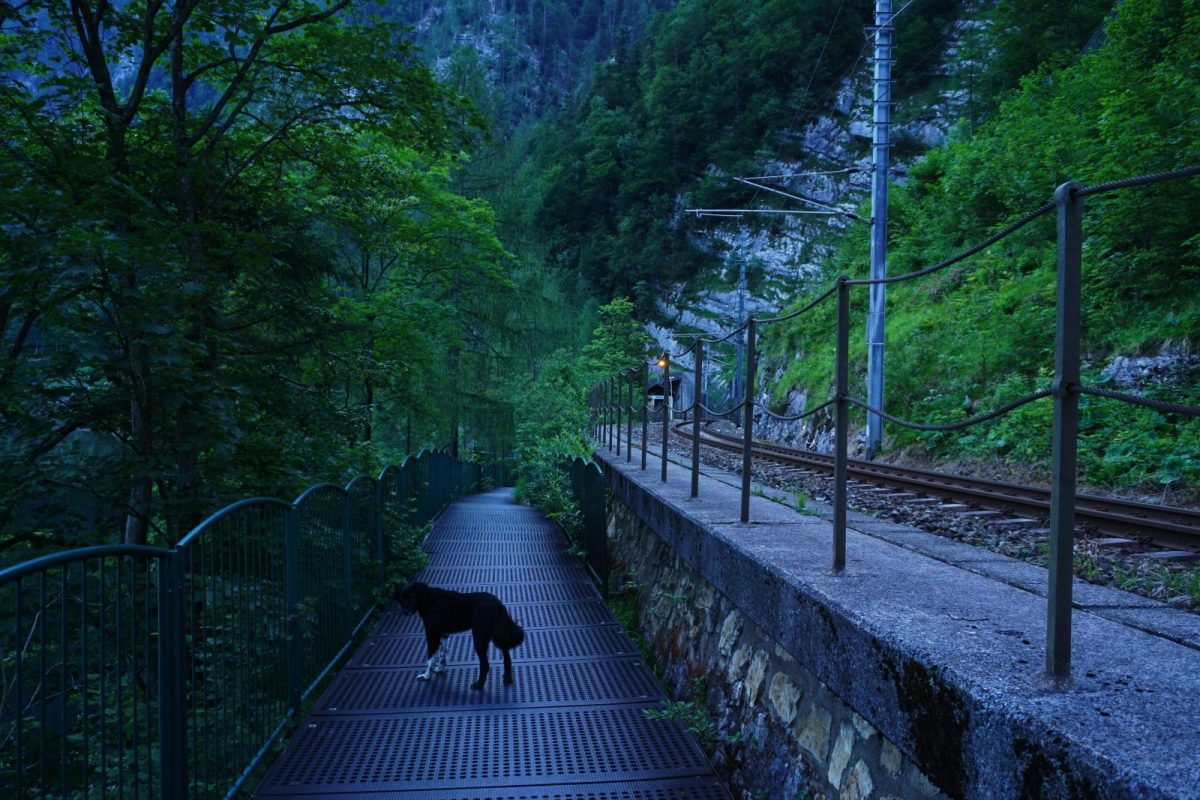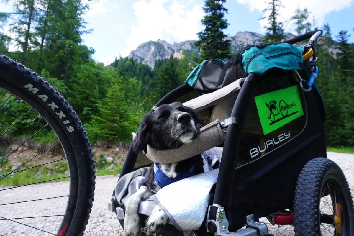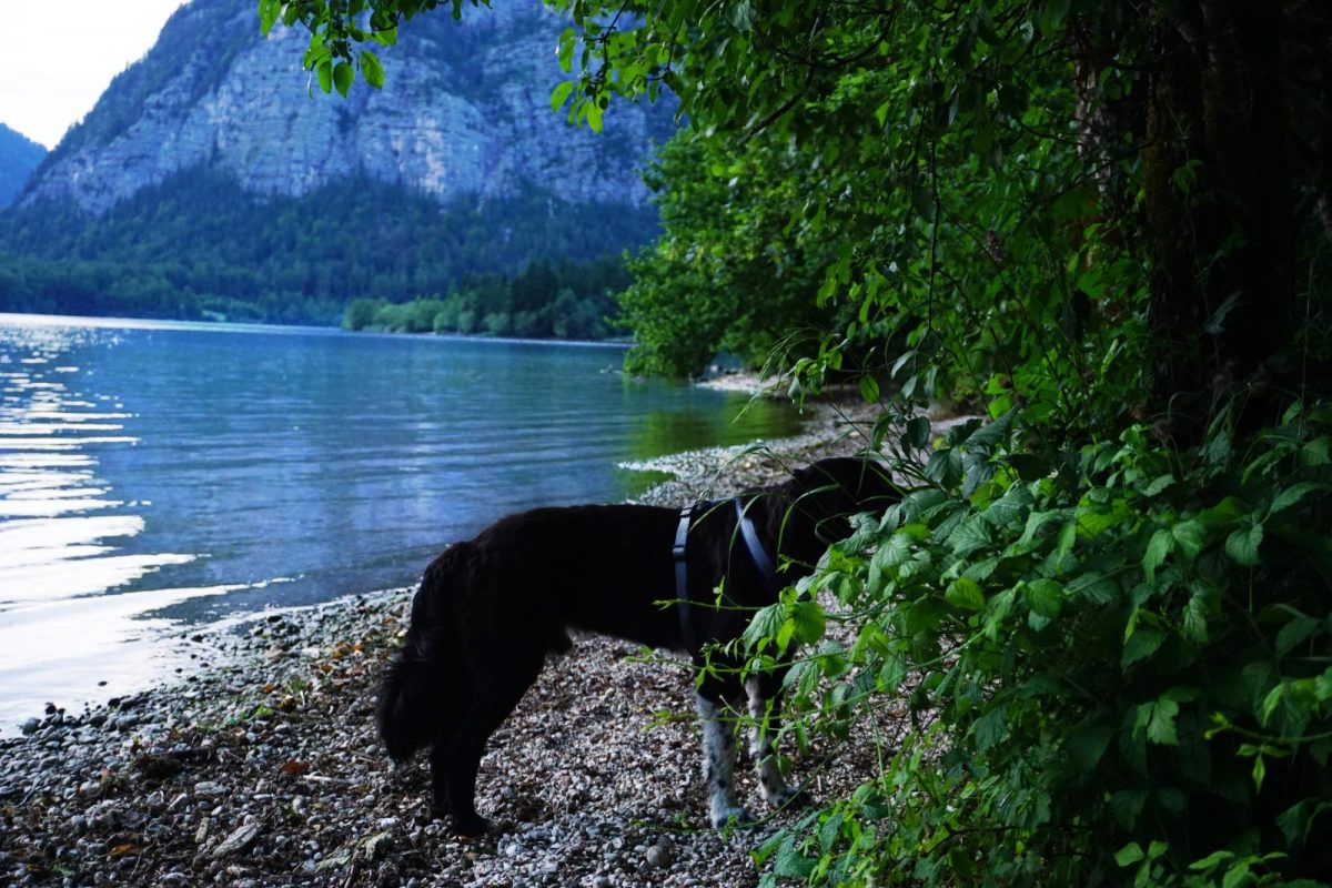 Für den nächsten Morgen hatte ich den Wecker auf 5 Uhr gestellt. Ohne Frühstück waren die Piselotten schnell zusammen gepackt. Ich hatte mangels Gepäckträger ja kein Kochgeschirr dabei – eigentlich totaler Quatsch, wenn man auf Campingplätze geht. Und dieser Tag war noch dazu ein Sonntag. Es würde kein Lebensmittelgeschäft geöffnet haben. Zunächst noch genoss ich die einsame Fahrt entlang des Hallstättersees. Lang hatte ich überlegt, ob ich der originalen Strecke über den Pötschenpass folgen sollte, denn der nächste Weg durch das Koppental schien auch nicht so schlecht. Doch der mühsam angelegte Rad- und Wanderweg auf der Ostseite des Sees lohnt sich. Für die Auffahrt zur Pötschenhöhe erwischte ich ungeplant einen schattigen Weg entlang eines Baches. Super für Napoli, um selbst zu laufen, denn damit war es aufgrund der Wärme bald wieder vorbei. Nachdem die beschilderte Route wieder gefunden war, ließ er sich bis zum Ödensee hauptsächlich kutschieren. In den kommenden Tagen merkte ich immer leicht, wenn es ihm zu viel wurde. Dann stellte er sich einfach vor den Anhänger – etwas, was er sonst NIE tut – und er durfte meist einsteigen.