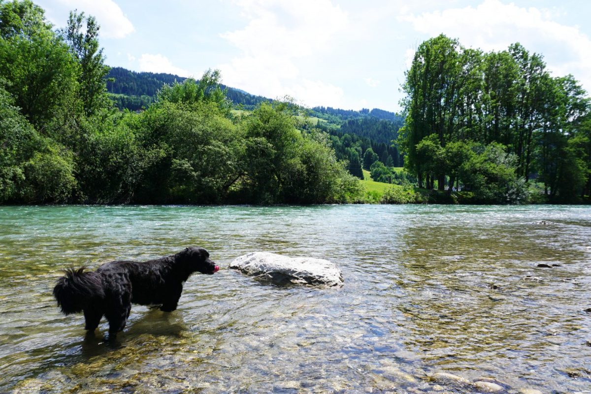 Irgendwie kam ich nicht so recht in den Flow. Hund rein in den Hänger für die Abfahrt, Hund raus für eine Auffahrt. Der fand es auch doof und hatte sozusagen die Schnauze voll. Immer öfter verweigerte er das Einsteigen und forderte mich statt dessen zum Spiel auf. Natürlich tat ich ihm den Gefallen. Aber irgendwann musste er dann halt doch im Hundeanhänger Platz nehmen. Nicht mal das Wetter bescherte uns einen gelungenen Abschied. Das beschauliche Lammertal ist abgesehen von ausgedehnten Waldflächen auch durchaus reizvoll. Doch wo man die Gipfel noch einmal hätte bewundern können, hatten sie sich in Wolken gehüllt. Bald lag eine graue Wolkendecke über der ganzen Landschaft und ich schaltete den Turbo ein, um schnell das Auto zu erreichen.