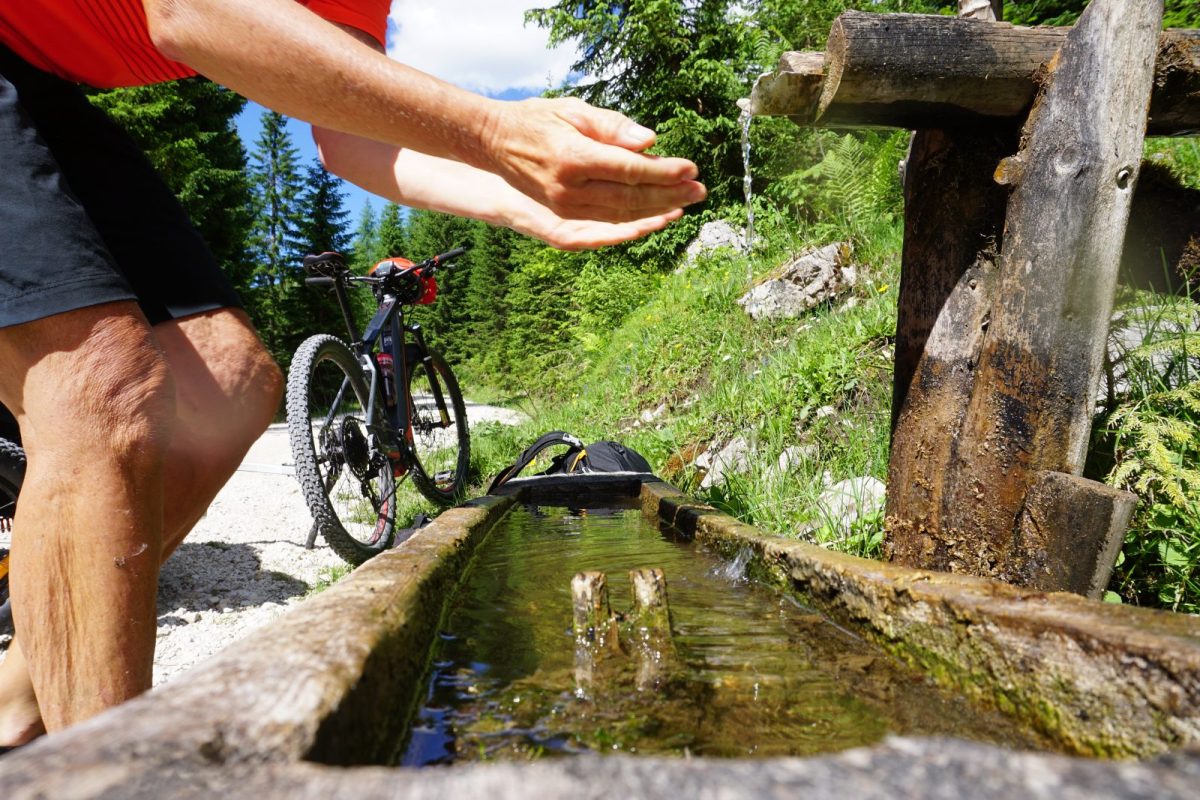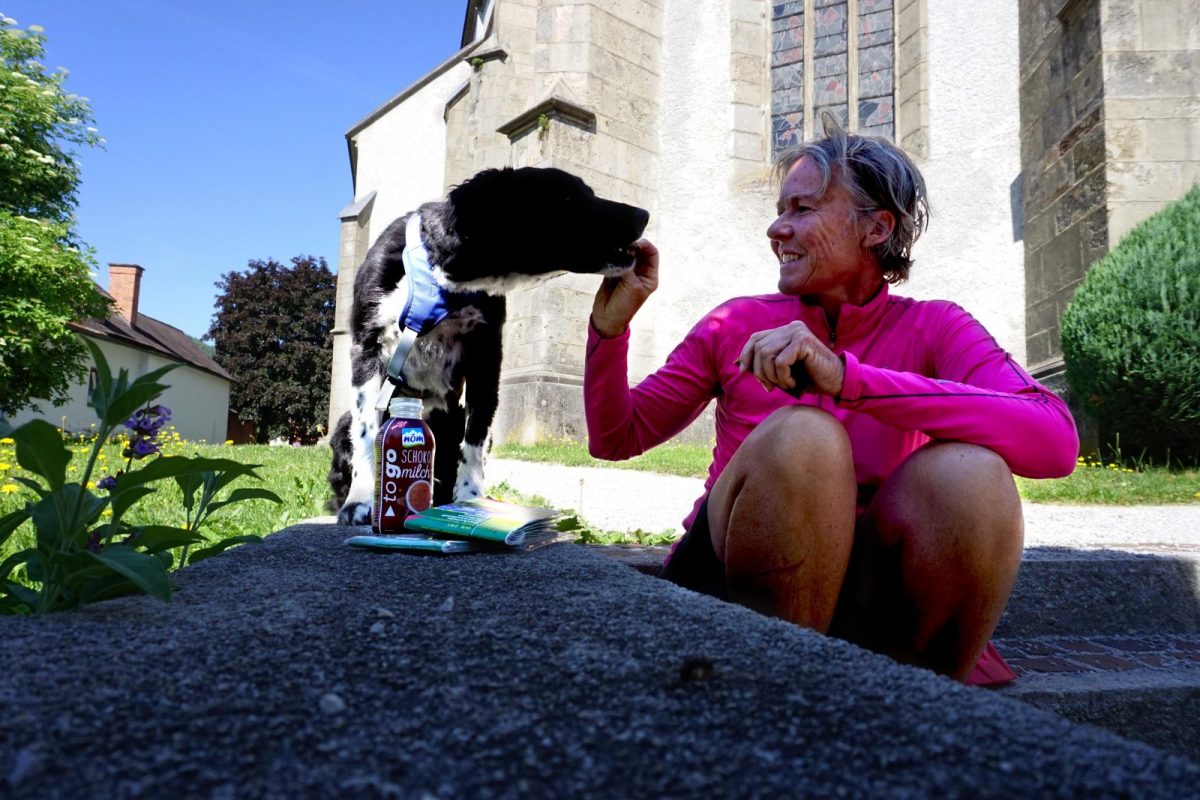 Im Supermarkt von Gosau gab es erst mal eine Wurst für Napoli, der schon ziemlich müde in seinem Anhänger schlummerte und ein spätes Frühstück sowie Power-Cola für mich. Es war mittlerweile ordentlich warm geworden. Nach einem Brunnen Ausschau haltend fiel mir auf, dass ich an keinem einzigen vorüber gekommen war. Und so sollte es auf der gesamten Runde bleiben. Sehr selten hat der Radler die Gelegenheit, seine Wasserflaschen zu füllen ohne einzukehren.