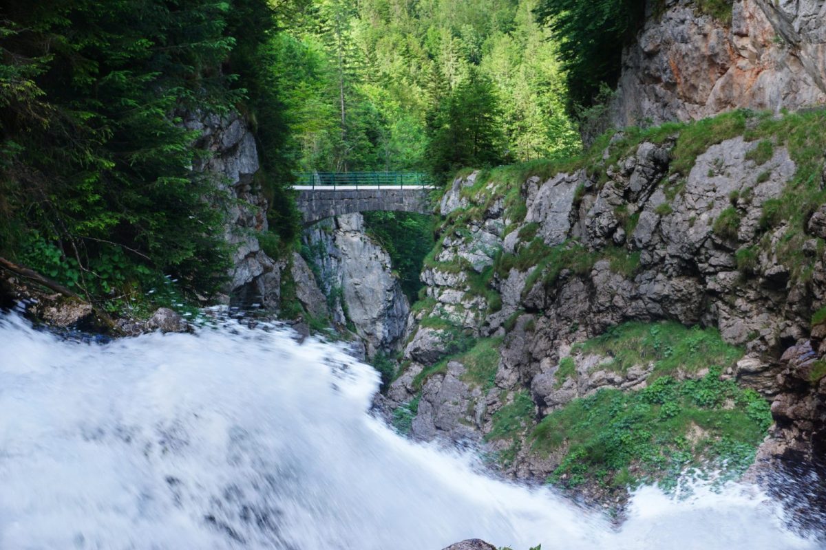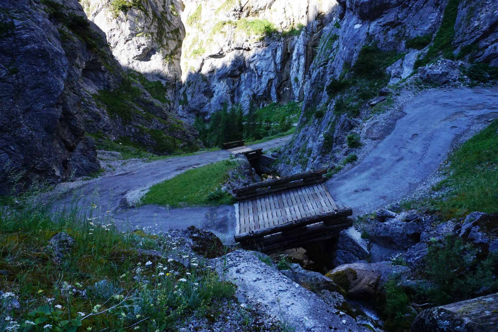 Die dritte Etappe war wieder mehr nach meinem Geschmack. Den verschlafenen Salzasee hinter uns lassend, erklommen wir mit dem anbrechenden Tag ein riesiges Hochplateau. Endlich zeigte sich auch das Dachsteinmassiv wieder. Auf einer Wiese in der ersten Morgensonne verspeiste ich meinen letzten Energieriegel vor wunderschöner Kulisse. Eine lange Abfahrt folgte, die ihren Höhepunkt in einer Schlucht fand. Windungsreich war ein Sträßchen zwischen die Felsen gebaut worden und ich bestaunte schiebend die Szenerie. Napoli sprang schwanzwedelnd neben mir her und freute sich über den kühlen Bergschatten.