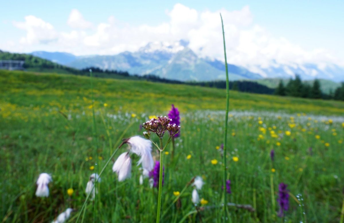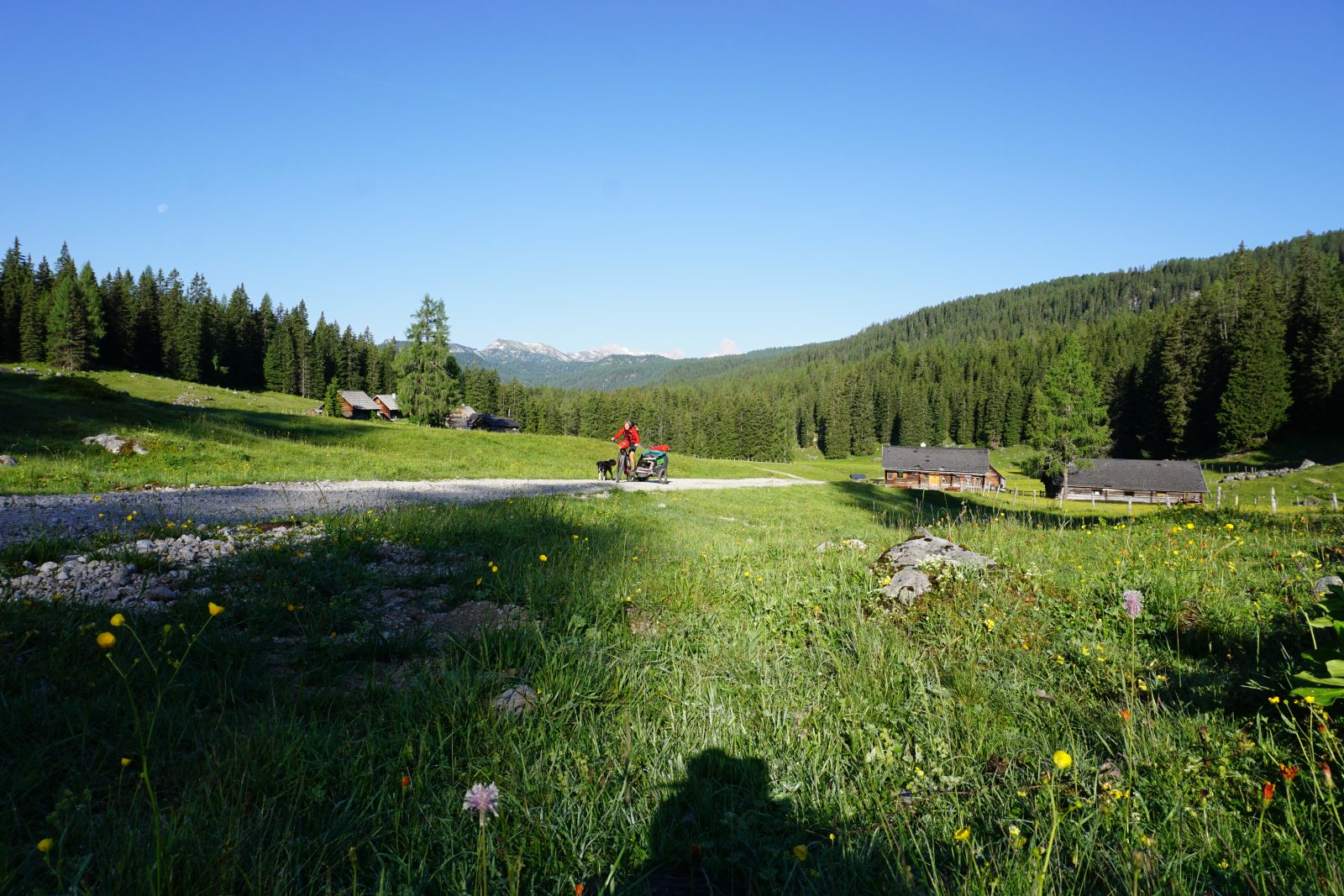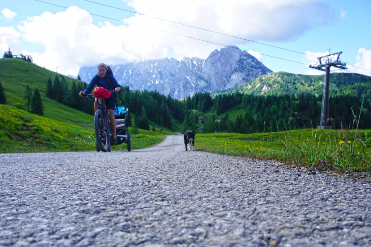 Schnell war unser Reiseanhänger startklar gemacht und es ging per Auto zum Startpunkt (Details zum Material und zur Strecke gibt’s am Ende des Berichts). Die Wettervorhersage war für 4 Tage sehr gut. Zu gut eigentlich, denn 30 Grad sind im Grunde zu heiß für Aktivitäten mit meinen kleinen Freund. Auch in dieser Hinsicht harmonieren wir zwei nicht so rasend gut. Ich mag’s nämlich warm und sonnig, vor allem beim Zelten. Den wilden Jahren bin ich längst entwachsen. Mein Rücken streikt bei Kälte und Nässe und meine Motivation erst recht. So war ich froh über eine kühlere erste Auffahrt in’s Skigebiet Hornspitz, auf der ich mich um Napoli’s Wohlbefinden nicht sorgen musste. Wie auf unseren Bike&Hike Touren trat ich mit der untersten Unterstützungsstufe fleißig in die Pedale während Napoli hier schnüffelte und dort markierte. Die Rückblicke in den Tennengau waren wunderschön auch wenn sich das Tennengebirge in Wolken hüllte. Eine liebliche Landschaft ist das, die mir noch recht verschlafen erscheint.