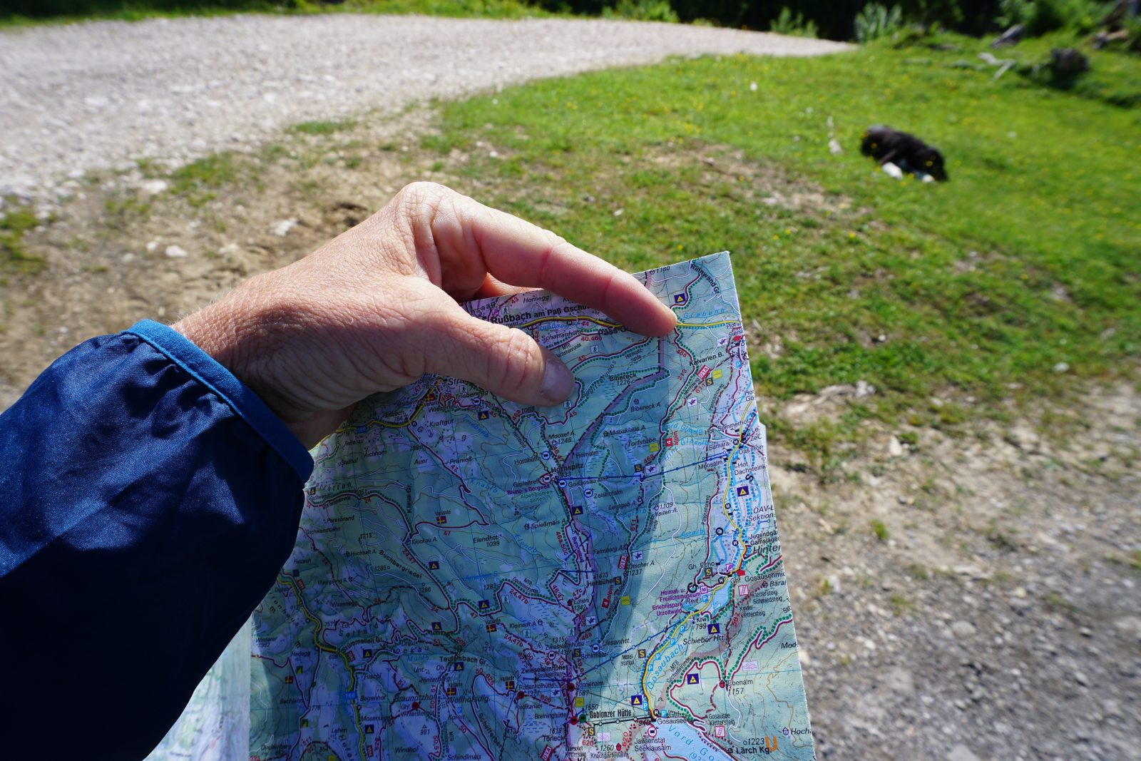 Die Dachstein Runde (genau so ist es auf den weißen Wegweisern zu lesen) ist bestens ausgeschildert. Im Prinzip kann man seinen Weg ohne Karte und Navi finden, doch ich habe gern den großen Überblick und hatte zwei Landkarten im Gepäck, die die gesamte Strecke abdecken. Den Wegweisern ist die Schwierigkeit des jeweils nächsten Streckenabschnittes zu entnehmen. Es gibt eine eBike-Variante, eine blaue, rote und schwarze. Die Besonderheit der eBike Version hat sich mir nicht erschlossen. Ladestationen habe ich nämlich nirgends gesehen. Auf dem höchsten Punkt des Hornspitz stellten ausnahmsweise drei Wegweiser alternative Abfahrten zur Auswahl. Eine blaue, eine rote und eine schwarze. Auf der Karte erkannte ich, dass die schwarze Abfahrt über einen gestrichelten Wanderweg führte. Nichts für mich mit Anhänger. Doch die rote – warum nicht mal versuchen? Die nächste halbe Stunde schob ich also mein Rad bergab über eine elend steile Versorgungspiste und musste immer wieder meinen Anhänger abbremsen, der mich überholen wollte. OK, also kam für uns nur die blaue Strecke in Frage. Doch in den folgenden vier Tagen fand ich selten mal einen schwarzen oder roten Abzweig und hatte somit ohnehin keine Wahl zu treffen.