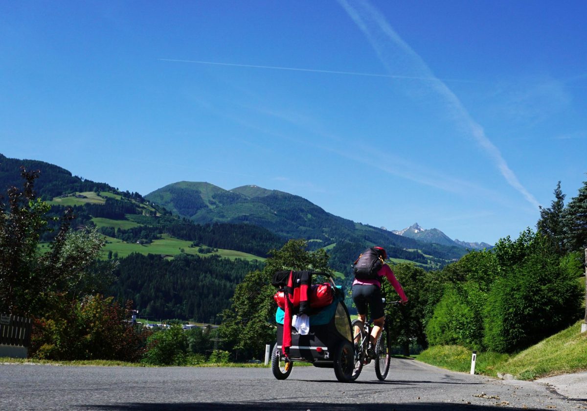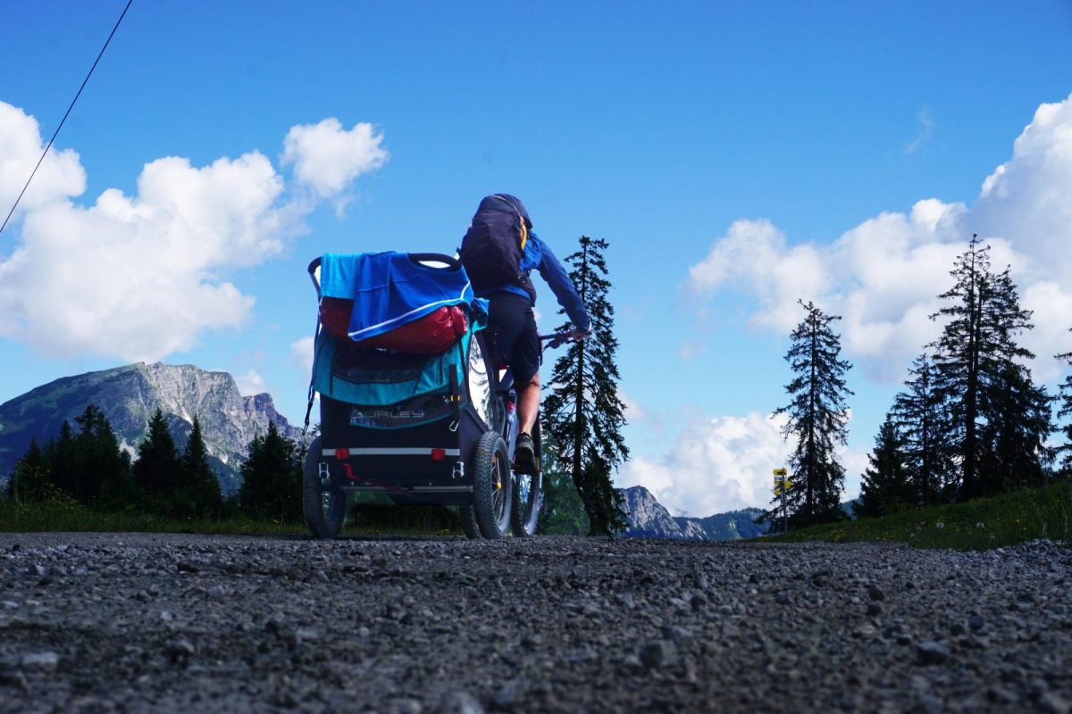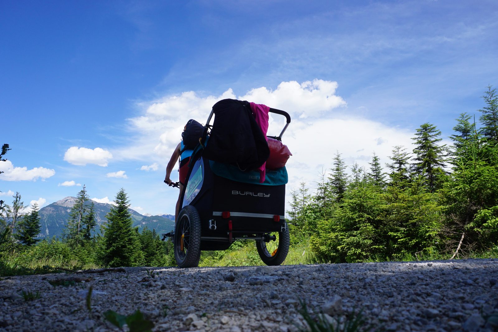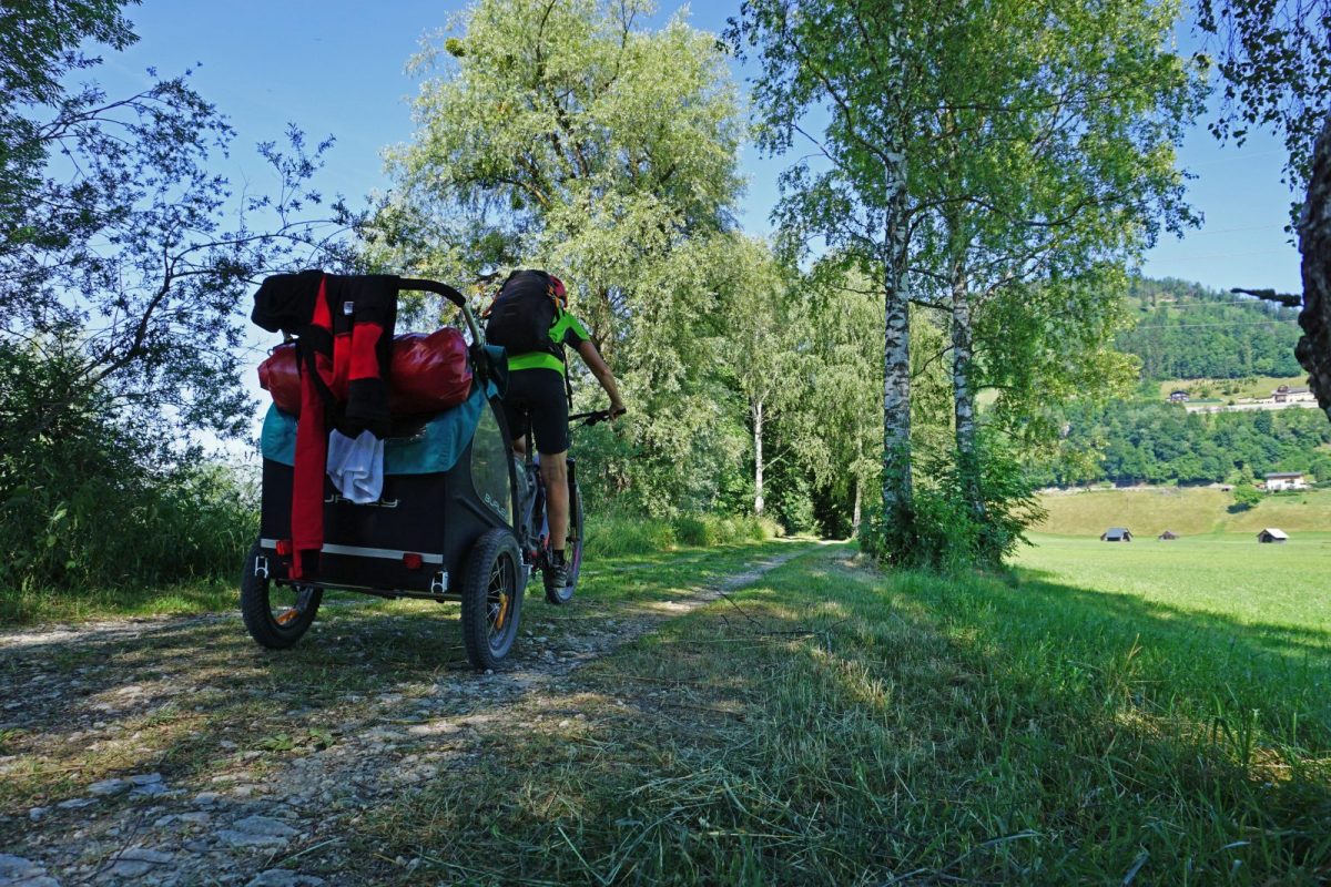 Als Reiseanhänger verwende ich am Liebsten meinen umgebauten Burley Encore X Kinderanhänger. Er ist schön geräumig und bietet vor allem jede Menge Stauraum. Das war auf dieser Reise ganz besonders wichtig weil ich für mein neues eBike noch keinen Gepäckträger kaufen konnte – Lieferengpässe wohin man schaut. Sowohl mein schnell genähtes Innenfach hatte wunderbar funktioniert als auch die Befestigung des Schlafsacks auf dem Dach bzw. am Schiebebügel hielt einwandfrei. Im Rucksack hatte ich nach Art von Transalps lediglich Wasserflaschen, Wechselkleidung, Kamera und was man sonst noch an Kleinzeug mitschleppt.