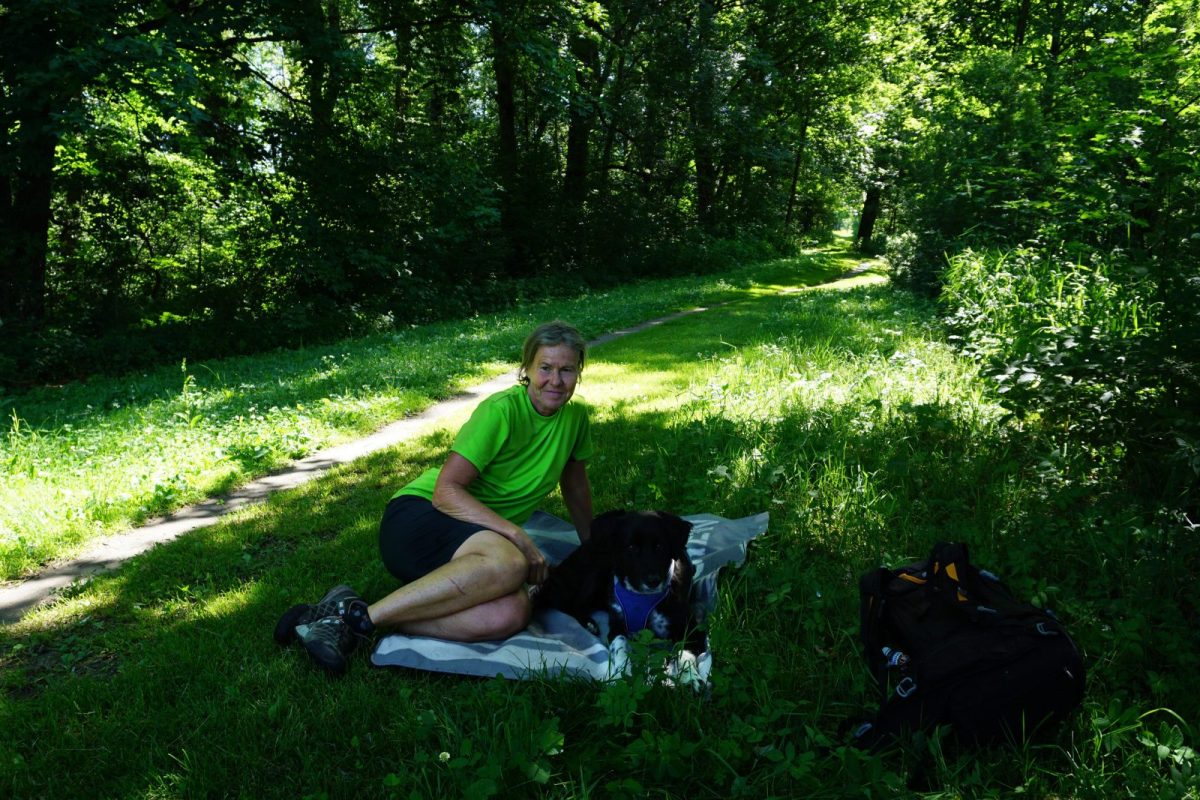 Ein Teil dieser Etappe verläuft staubig und schattenlos in der Nähe einer befahrenen Bundesstraße, was mir gar nicht gefiel. Mit Erreichen des Ödensees ist dieser unschöne Abschnitt vorüber und am Ufer des hübschen Badeweihers lässt sich leicht ein diskretes und schattiges Plätzchen finden um ein paar Züge zu schwimmen. Einige Stunden verbrachten wir dort. Ich dösend, Napoli Fliegen fangend, unruhig zwischen Sonne und Schatten hin und her tigernd. Ein Badetag mit meinem Hund ist so nervig wie Einkaufen mit Kindern. Stelle ich mir zumindest vor. Ich habe ja keine Kinder.
