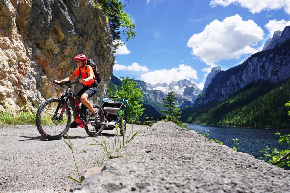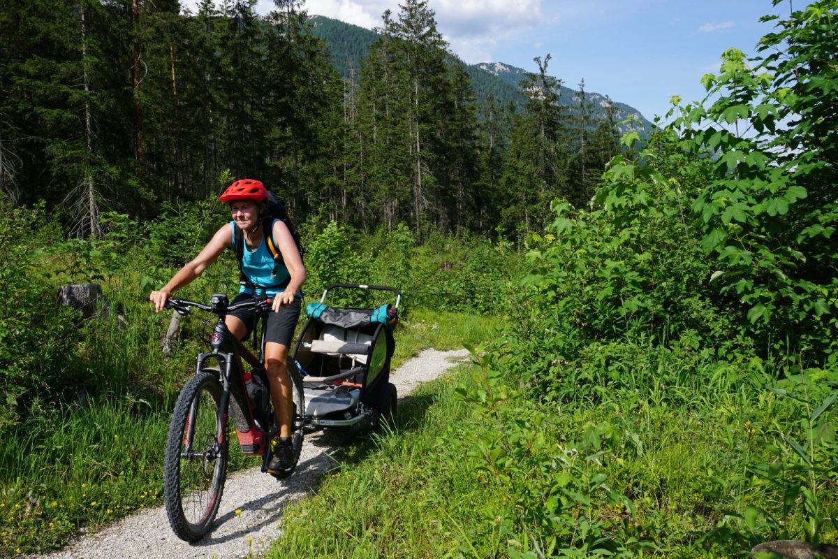 Die weitere Strecke bis zum nächsten Etappenziel Bad Mitterndorf verlief über beste Forststraßen mit ein paar kernigen Rampen, wenig aussichtsreich und somit recht langweilig. Die leichte Version der Dachstein Runde führt übrigens hauptsächlich über Forststraßen, die meist glatt sind, wie ein Babypopo. Mit Anhänger ist wirklich alles gut fahrbar. Während ich so vor mich hin radelte, sinnierte ich, für wen sich die Umrundung des Dachstein gut eignet. Ich denke, sie macht Radlern Spaß, die gern abseits von Straßen unterwegs sind, doch keine technischen Herausforderungen suchen. Auch für Familien kann ich mir die Unternehmung spannend vorstellen. Wenn jeder selbst radelt, braucht man keine eBikes und damit wäre wildes Zelten möglich. Ende Juni habe ich auf der gesamten Strecke jedenfalls kaum Etappenfahrer getroffen, was ich verwunderlich fand.
