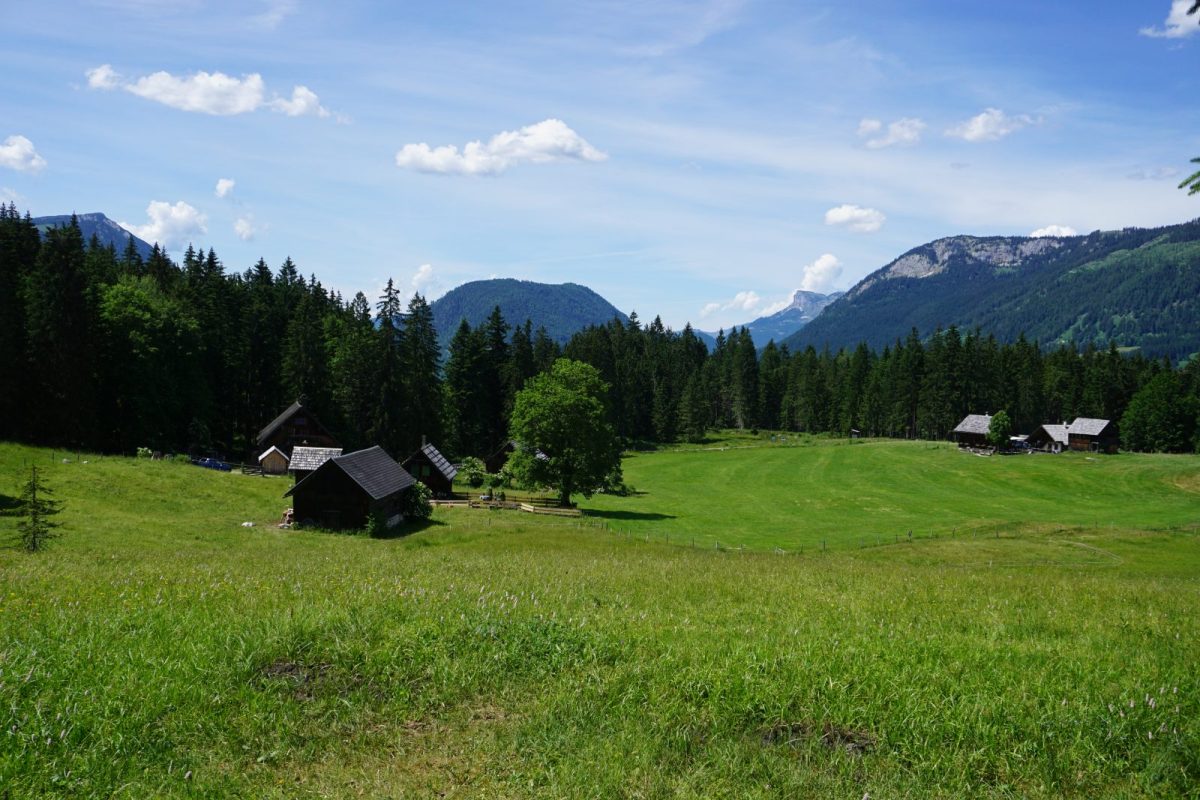 Irgendwie kam ich nicht so recht in den Flow. Hund rein in den Hänger für die Abfahrt, Hund raus für eine Auffahrt. Der fand es auch doof und hatte sozusagen die Schnauze voll. Immer öfter verweigerte er das Einsteigen und forderte mich statt dessen zum Spiel auf. Natürlich tat ich ihm den Gefallen. Aber irgendwann musste er dann halt doch im Hundeanhänger Platz nehmen. Nicht mal das Wetter bescherte uns einen gelungenen Abschied. Das beschauliche Lammertal ist abgesehen von ausgedehnten Waldflächen auch durchaus reizvoll. Doch wo man die Gipfel noch einmal hätte bewundern können, hatten sie sich in Wolken gehüllt. Bald lag eine graue Wolkendecke über der ganzen Landschaft und ich schaltete den Turbo ein, um schnell das Auto zu erreichen.