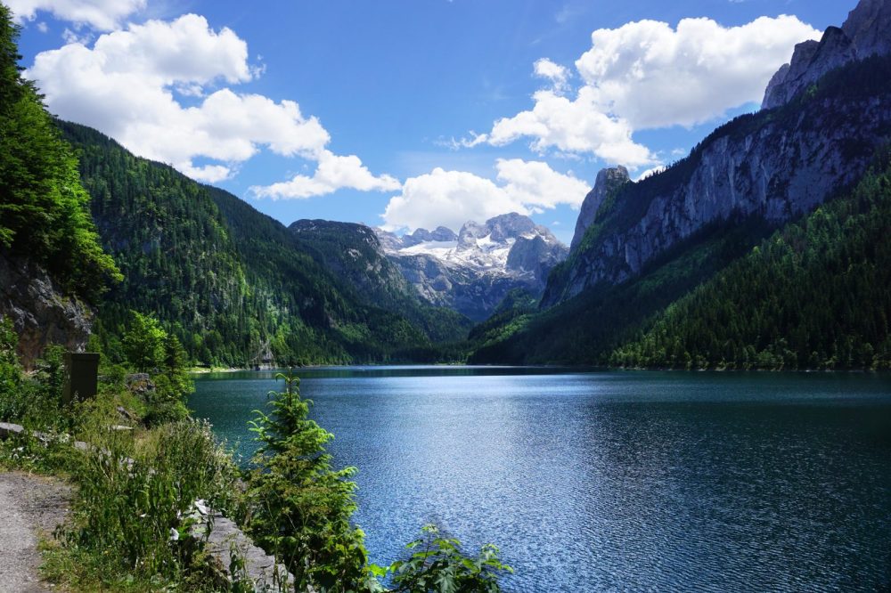 Für den nächsten Morgen hatte ich den Wecker auf 5 Uhr gestellt. Ohne Frühstück waren die Piselotten schnell zusammen gepackt. Ich hatte mangels Gepäckträger ja kein Kochgeschirr dabei – eigentlich totaler Quatsch, wenn man auf Campingplätze geht. Und dieser Tag war noch dazu ein Sonntag. Es würde kein Lebensmittelgeschäft geöffnet haben. Zunächst noch genoss ich die einsame Fahrt entlang des Hallstättersees. Lang hatte ich überlegt, ob ich der originalen Strecke über den Pötschenpass folgen sollte, denn der nächste Weg durch das Koppental schien auch nicht so schlecht. Doch der mühsam angelegte Rad- und Wanderweg auf der Ostseite des Sees lohnt sich. Für die Auffahrt zur Pötschenhöhe erwischte ich ungeplant einen schattigen Weg entlang eines Baches. Super für Napoli, um selbst zu laufen, denn damit war es aufgrund der Wärme bald wieder vorbei. Nachdem die beschilderte Route wieder gefunden war, ließ er sich bis zum Ödensee hauptsächlich kutschieren. In den kommenden Tagen merkte ich immer leicht, wenn es ihm zu viel wurde. Dann stellte er sich einfach vor den Anhänger – etwas, was er sonst NIE tut – und er durfte meist einsteigen.