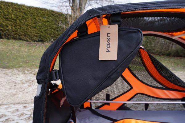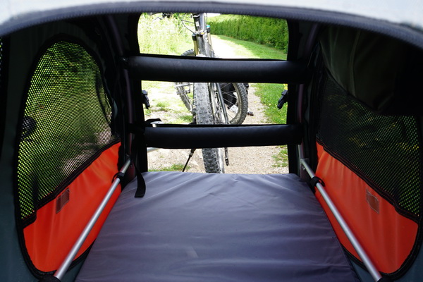 Der Anhänger hat übrigens kein Staufach. Weil ich immer mindestens zwei Schlösser dabei habe, habe ich innen zwei Rahmentaschen befestigt.