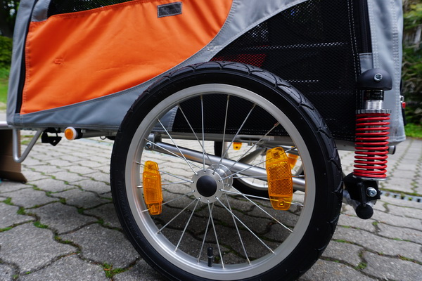 Durch die Federung liegt der Schwerpunkt des DogBus trotz der kleinen 16 Zoll Laufräder recht hoch, was ich aber bislang nicht als Nachteil empfunden habe. Er hat sich auch auf unebenen Wegen als recht kippstabil erwiesen.