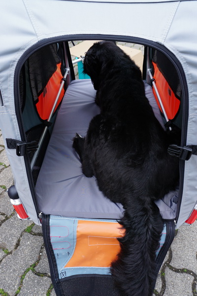 Sitzend überragt Napoli den Anhänger deutlich. Das funktioniert nur, wenn das vordere Verdeck zumindest im oberen Teil geöffnet ist. Muss er sich zum Aussteigen im Anhänger umdrehen, wird es durch die fehlende Höhe ungemütlich, so dass er bevorzugt vorne heraus springt.