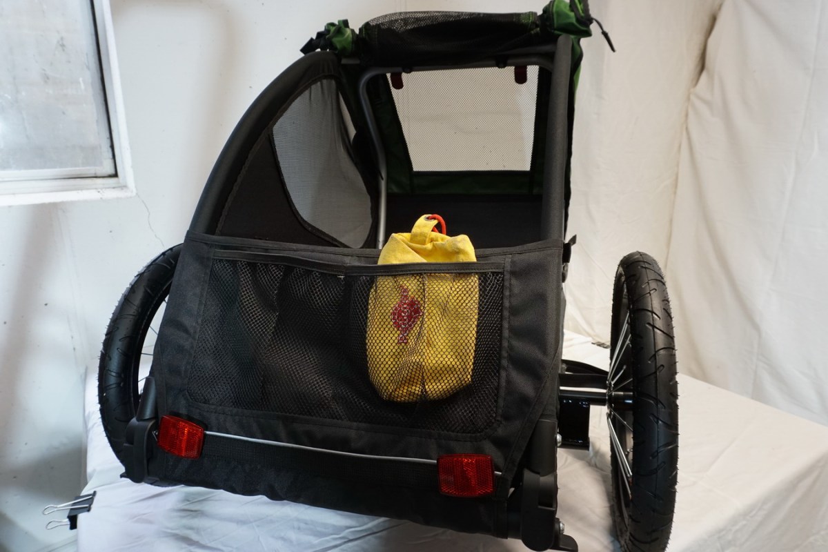 Mit dem Verdeck stand ich schon immer auf Kriegsfuß. Es lässt sich komplett abnehmen, vorne und / oder hinten hochrollen. Zum einen ist das Hochrollen nichts, was man während einer Radtour häufig verändern möchte. Ständiges rein, raus und Verdeck öffnen und schließen macht eindeutig keinen Spaß. Zum anderen bietet es hochgerollt und auch verschlossen keinen ausreichenden Schatten weil es großflächig mit Netz versehen ist. Und nun kommen wir zur ersten Abweichung vom Vorgängermodell: beim aktuellen Modell hat man auf den Regenschutz verzichtet. Der Anhänger hält nicht ansatzweise einem Regen stand und es gibt auch keinen Schutz als Zubehör.