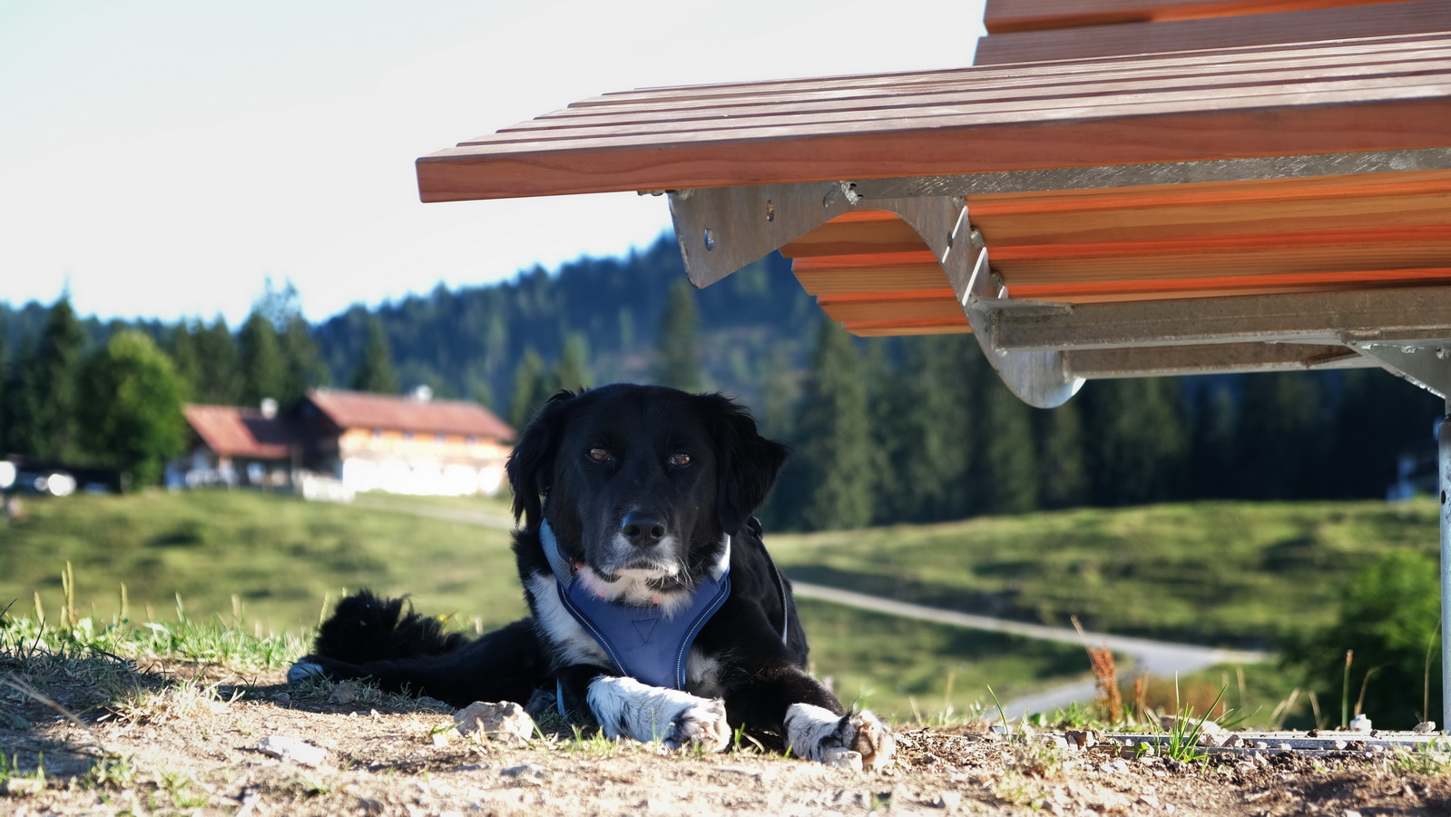 Gleich zu Beginn chauffierte ich meinen kleinen schwarzen Gefährten den Teisenberg hinauf. Die Route verläuft nicht über den höchsten Punkt, aber einige Höhenmeter sind es durchaus. Napoli HASST diesen Berg. Ich kann es nicht erklären, doch egal welche Strecke ich an diesem Teisenberg wähle, er begleitet mich laufend mit solchem Unmut, dass es mich zur Weissglut bringt. Also wurde Herr Hund bis fast zum höchsten Punkt befördert und durfte dann ein Stückchen bergab traben.
