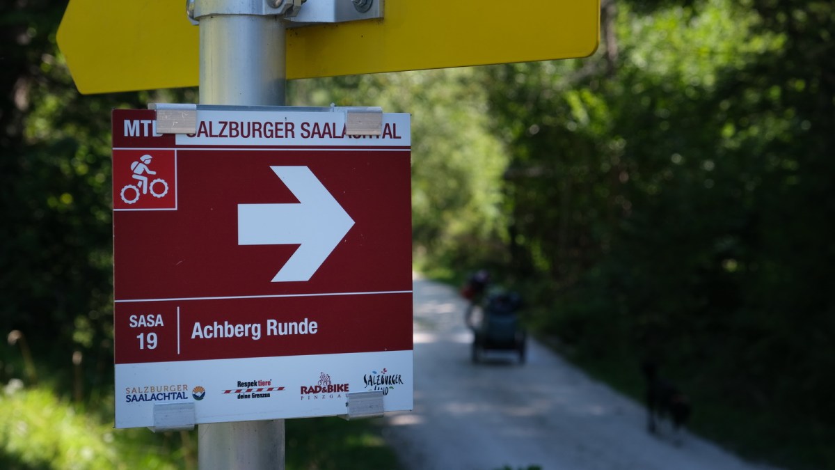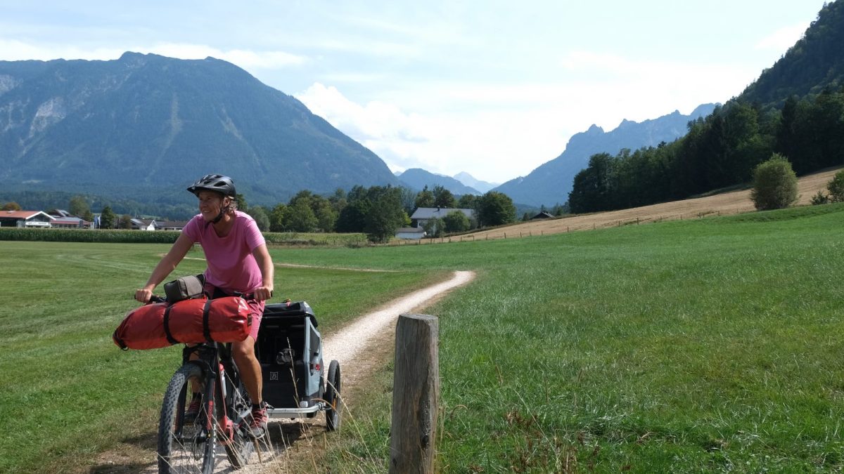 Ist die lange Abfahrt zur Saalach vollbracht, stehen der geteerte Radweg auf ihrer linken Flußseite oder der Naturweg auf der rechten Flußseite zur Auswahl. Ich entschied mich für letzteren und vollendete die Runde mit einem müden Hund im Anhänger an Bad Reichenhall vorbei nach Hause.