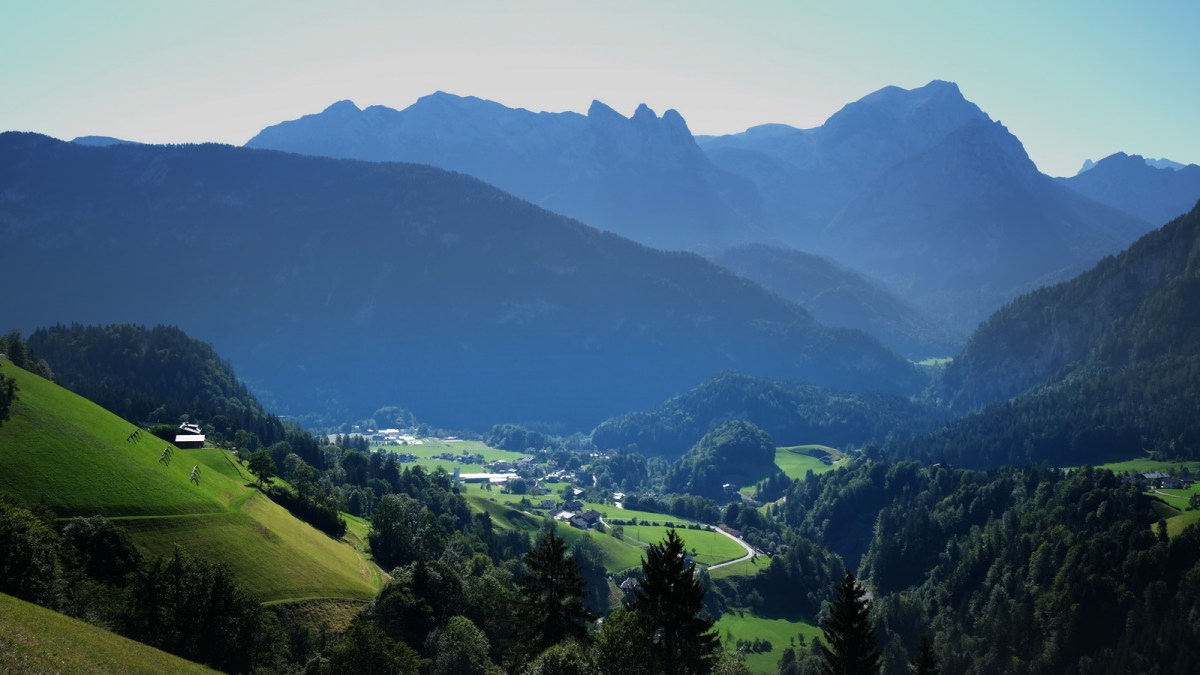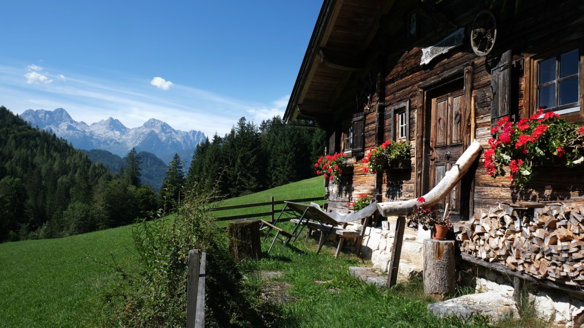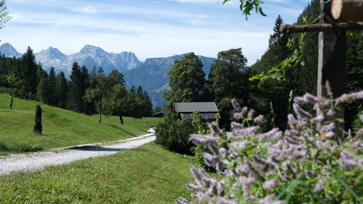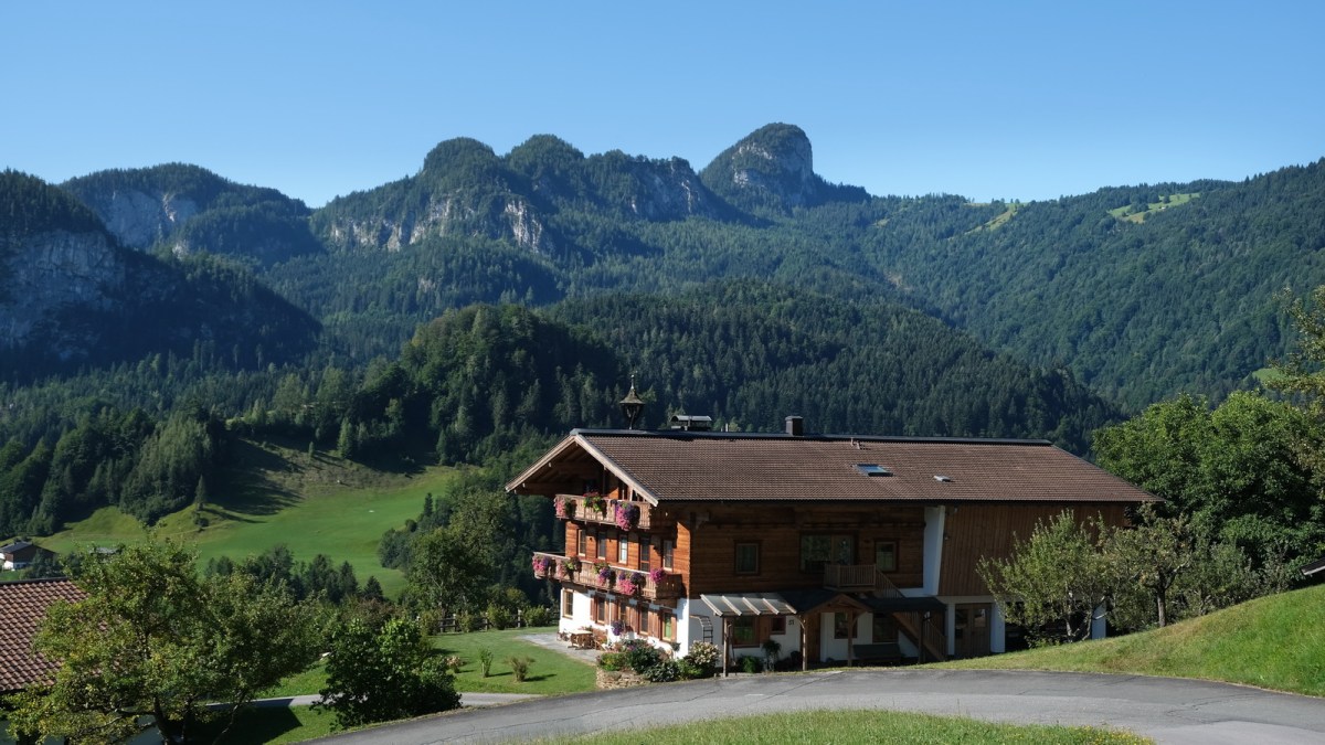 Die zunächst geschotterte und dann asphaltierte Abfahrt ins Tal ist fantastisch. Vor allem im unteren Teil zwang mich der Blick ins Tal der Saalach immer wieder zum anhalten und fotografieren. Unten angelangt nutzt man ein kurzes Stück den Tauernradweg entlang einer stark befahrenen Transitstrecke um zur nächsten Auffahrt zu gelangen. Im kleinen Ort Reith beginnt die Steigung, die teilweise ordentlich zur Sache geht. Der Motor muss hier einiges leisten und Gefühl ist gefragt, damit das Hinterrad nicht durch rutscht. Doch sind diese Abschnitte nicht lang. An einem Brunnen stoppte ich, dankbar für frisches Trinkwasser. Bähm, der Blick zurück in die Leoganger Steinberge war fantastisch.