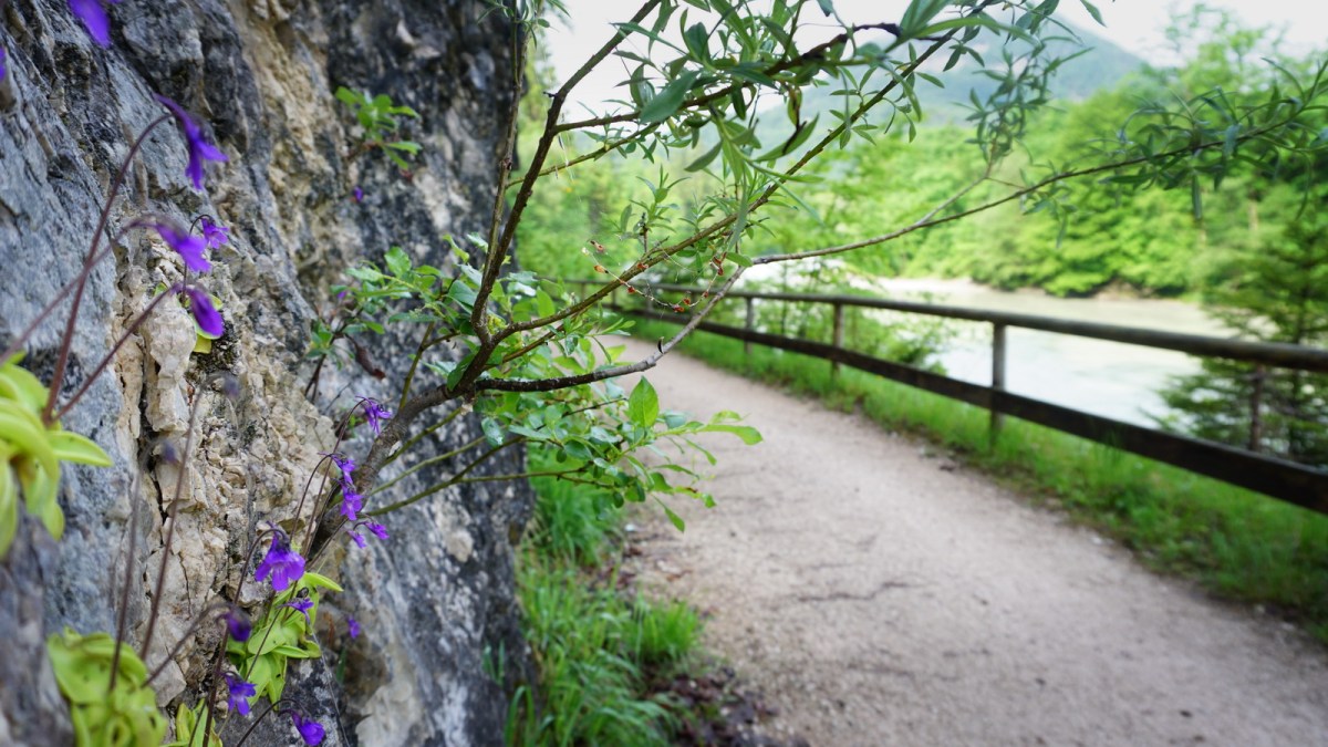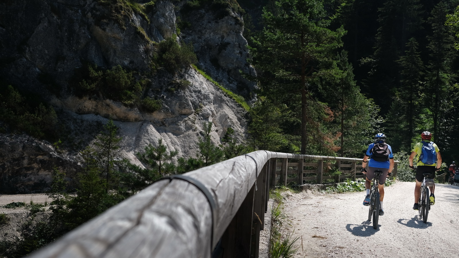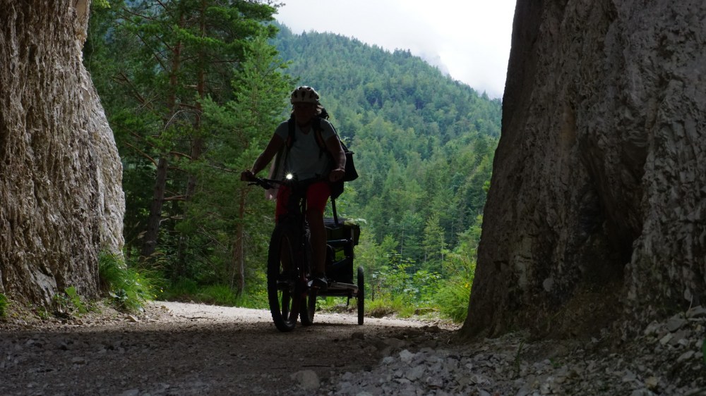 Früher galt diese Mountainbikestrecke an der Aschauer Klamm als schwierig. Doch mittlerweile hat man den Pfad zum Fahrweg verbreitert, Tunnel in den bröseligen Fels gegraben und alles versichert, so dass auch Anhänger hier problemlos fahren können. Die Klamm selbst zeigt sich nicht, dafür rechterhand die steilen Felswände der Reiter Berge.