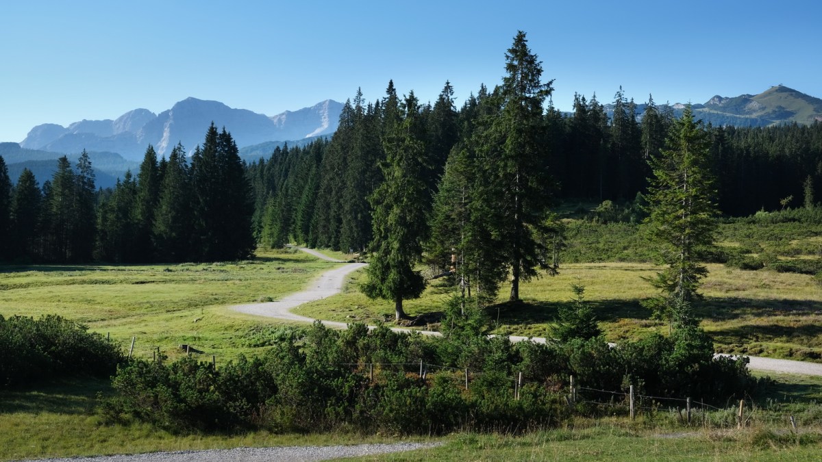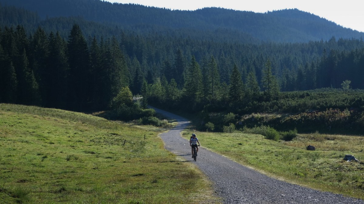 Die Wärme des nächsten Tages verlangte nach einem frühen Aufbruch. Unsere Strecke führte direkt bergan, wobei ich wählen konnte zwischen Asphalt und Schotter. Ich entschied mich für die Mautstraße, noch einsam im Schatten lag. So könnten wir den ersten Anstieg schnell hinter uns bringen. Napoli war guter Dinge und lief schön an meiner Seite. Die Alm war schnell erreicht und uns begrüßte die Sonne. Zwar fand ich die Stimmung unangenehm touristisch, doch die Morgenstimmung versöhnte dafür. Also ignorierte ich ein größeres Hotel mit riesiger Restaurantterasse, den üppigen Parkplatz und diverse andere Gastronomiebetriebe und wir genossen erst einmal den Blick über das Hochplateau. Nach nur wenigen Minuten ist der Rummel verlassen und man taucht ein in eine mystische Landschaft. Ein umfangreiches Wegenetz durchzieht das Plateau durch viel Wald, vorüber an Almwiesen, Latschen und Heidekraut.