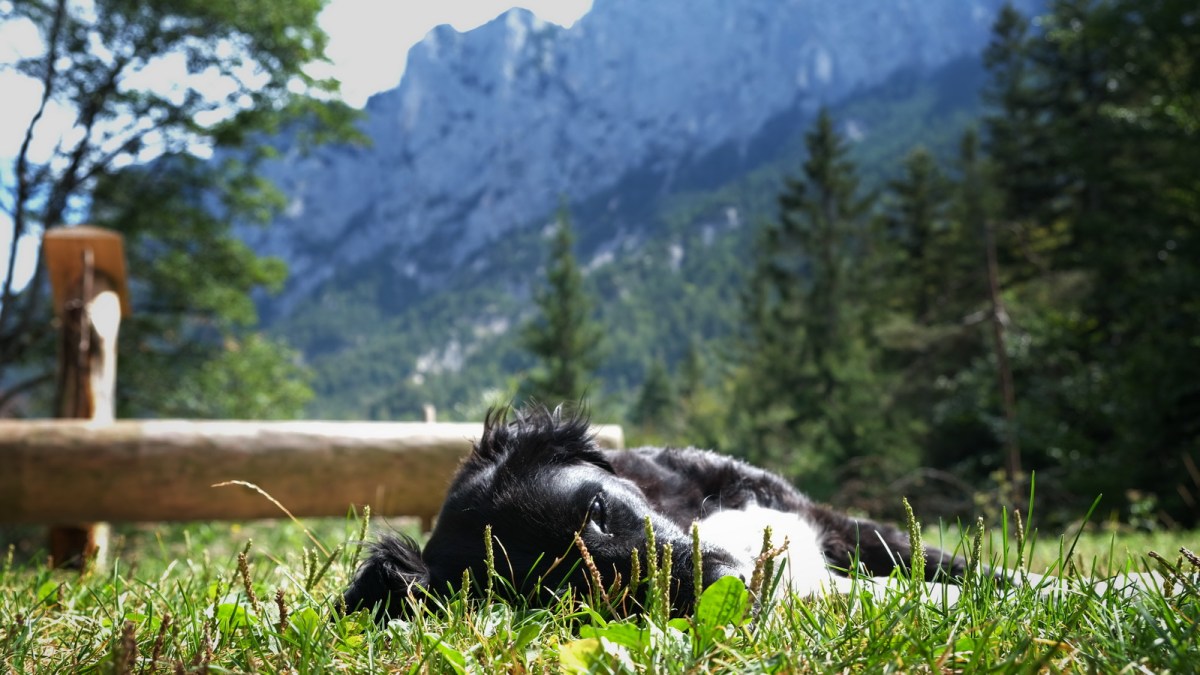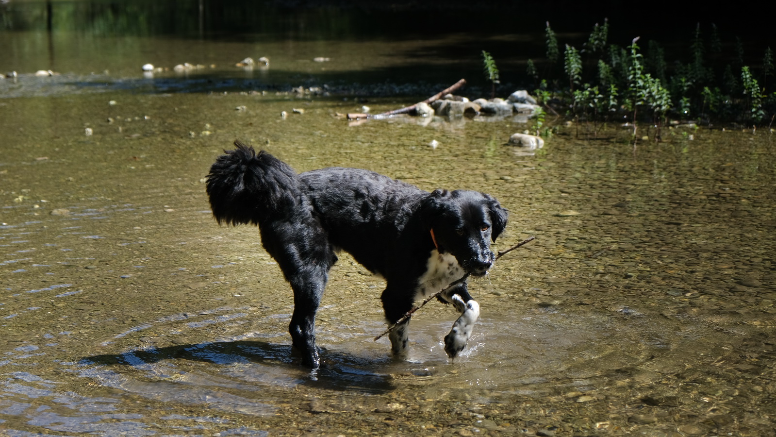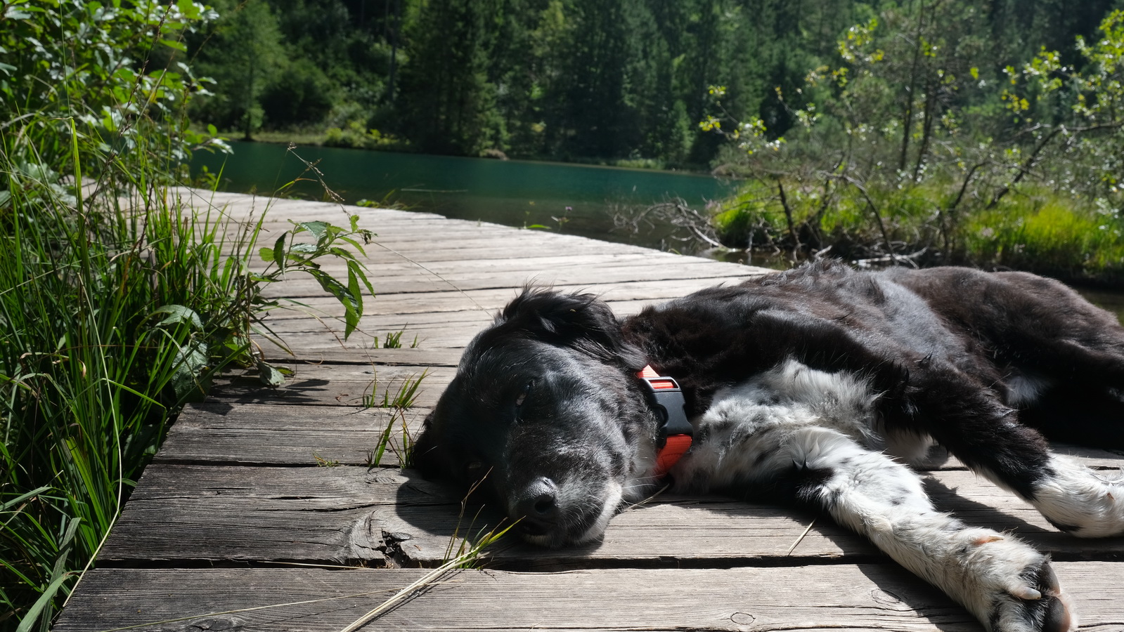 Auf der anderen Seite des Teisenbergs zweigt man noch vor Inzell in ein wunderschönes Naturschutzgebiet ab. Wasserreich ließ sich die Wärme des Tages hier gut ertragen und so dachten wohl viele andere Hundehalter. An jedem hübschen Gewässer haltend, fotografierend, filmend und plantschend kamen wir nur langsam voran. Aber – der Weg ist das Ziel. Es ging nicht darum, Strecke zu machen.