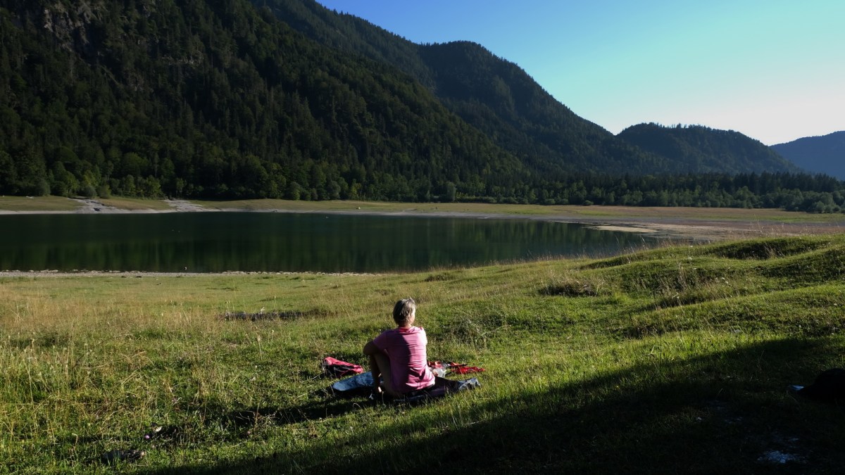 Zwar konnte ich kaum erwarten endlich ans Wasser zu kommen, doch brauchten wir noch Lebensmittel. Also, Abstecher nach Ruhpolding. Selbst gestärkt zog sich die nachfolgende Strecke lang hin bevor endlich der erste See erreicht war. Direkt an der Straße liegend ist der allerdings nur ein Vorgeschmack auf die Seen, die noch folgen. Am Mittersee war es mit meiner Geduld am Ende. Ein fast menschenleeres Ufer lud zu sehr zum Rasten ein auch wenn der See selbst erschreckend leer war. Egal, sich ausbreiten, alles von sich werfen, ins erfrischende Wasser springen. Die Tagesetappe war ja gar nicht lang, doch es reichte. Und das Bad war herrlich nachdem tiefer Matsch und Algen überwunden waren. Ein wenig konnte ich noch im warmen Gras sitzen, essen, die untergehende Sonne genießen – und überlegen, wie ich es mit dem Strom handhaben wollte. Ich entschied mich für den Campingplatz, den ich auf meiner Landkarte gesehen hatte. Doch es kam anders.