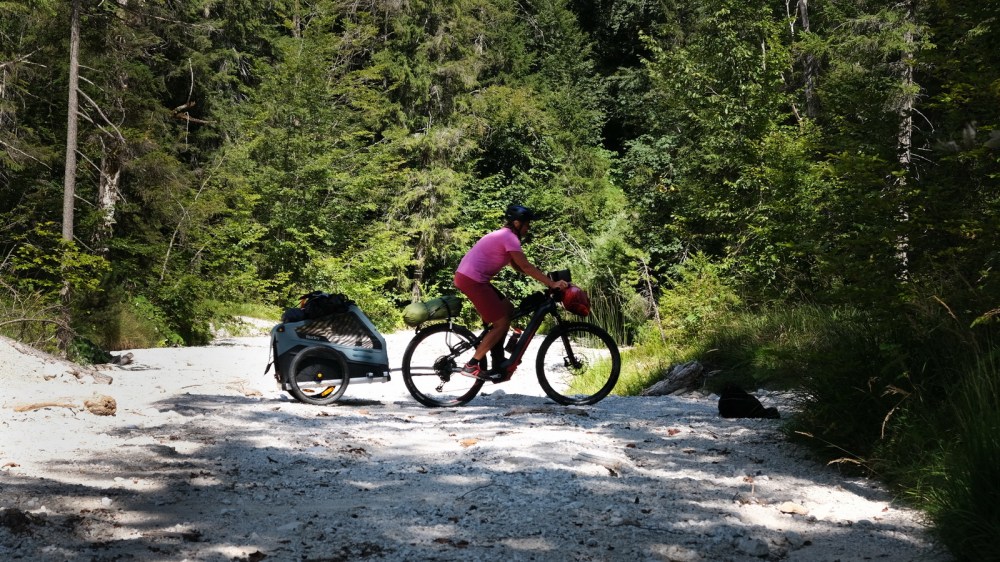 Die Wälder waren noch frisch vom nächtlichen Tau doch Napoli bestieg ungebeten seinen Anhänger. Das sind die Momente, an denen ich über die Wahl des eBikes glücklich bin. Mit normalem Rad würde mein kleiner Begleiter deutlich mehr laufen müssen und das wäre mir in der Wärme nicht recht. Mit Strom ziehe ich ihn notfalls überall hoch. Dennoch mache ich mir die Tourenwahl immer sehr schwer. Bergauf wünsche ich mir einen möglichst hohen Anteil an Forststraßen, so dass Napoli viel und ungestört laufen kann. Bergab ist es mir egal. Diese Tour ist nahezu perfekt. Bis auf wenige Sequenzen führt sie über Alm- und Forstwege sowie über Fahrradwege mit Naturbelag. Gravel halt.