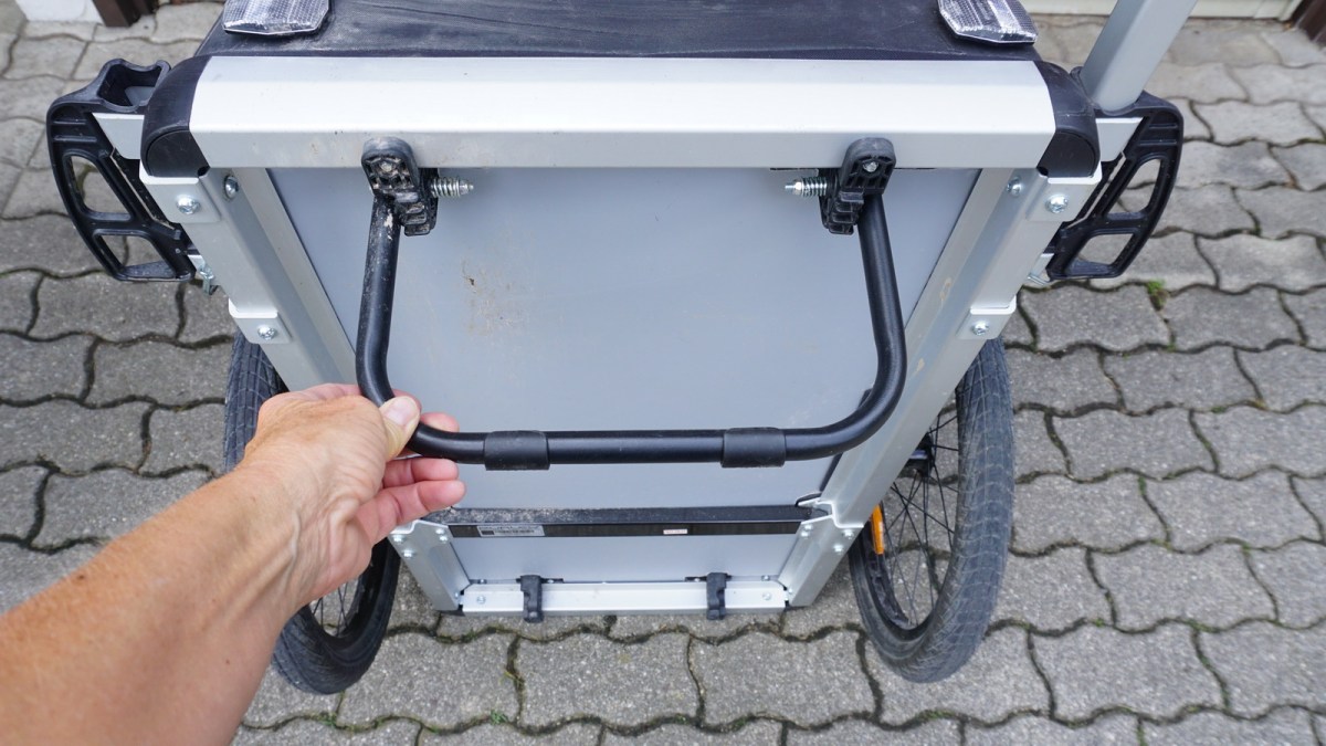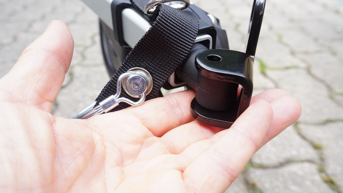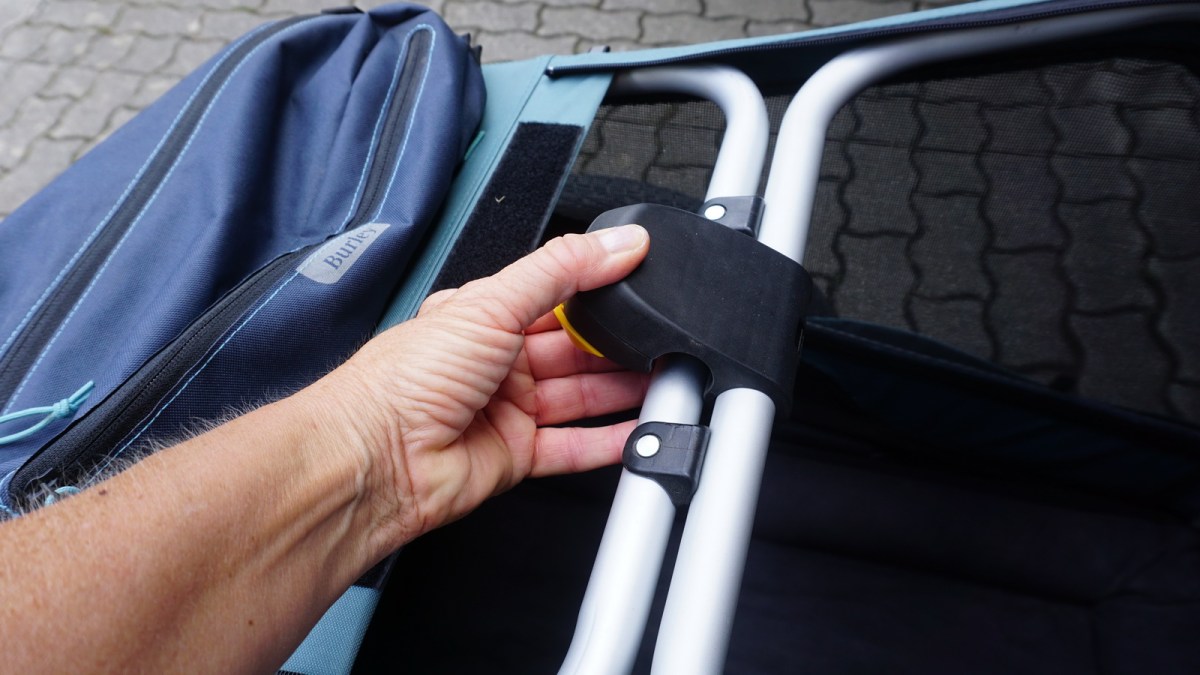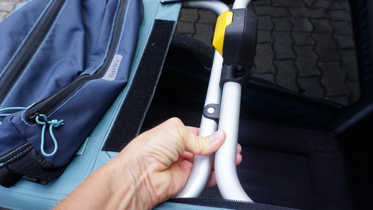 Eine Besonderheit des Bark Ranger ist sein Klappmechanismus. Er lässt sich zwar nicht ganz flach zusammen legen, dafür aber ruck-zuck. Das wäre für Burley nun keine Besonderheit, der Verschluss ist allerdings eine Neuerung. Während ich an allen Burley Anhängern, die ich kenne, die simplen, robusten, leichten und effizienten Bügelchen aus Metall schätze, ist der Verschluss am Bark Ranger ein größeres Kunststoffteil. Schade eigentlich und unverständlich.