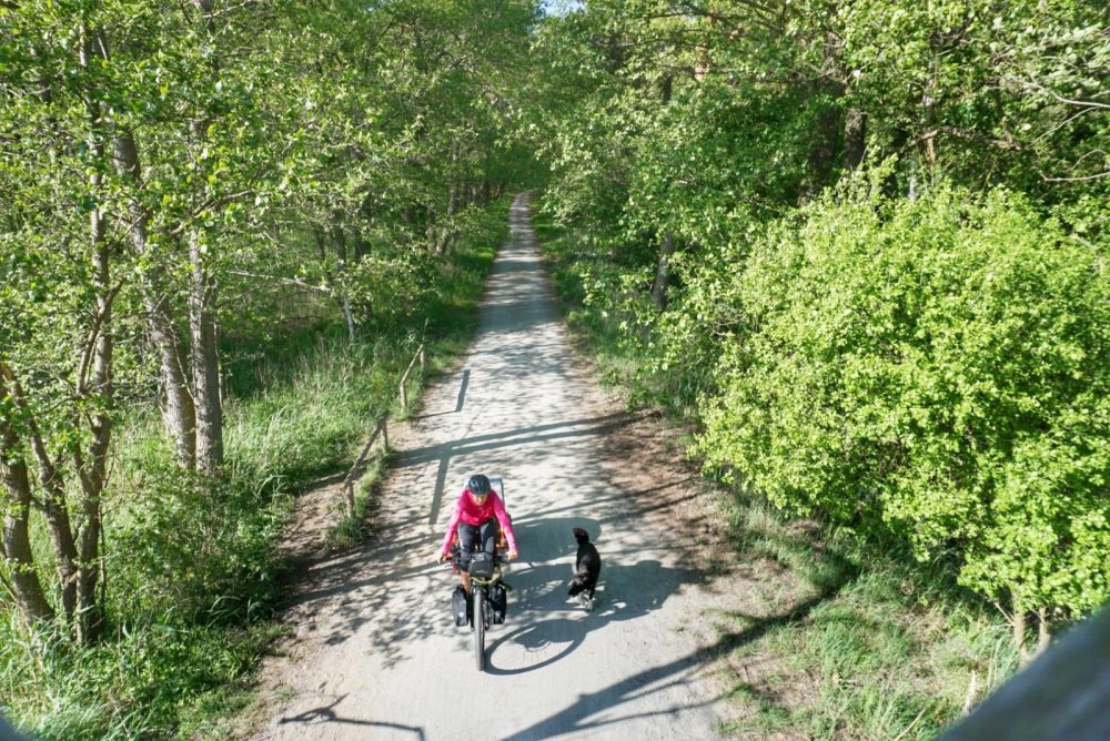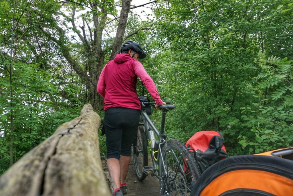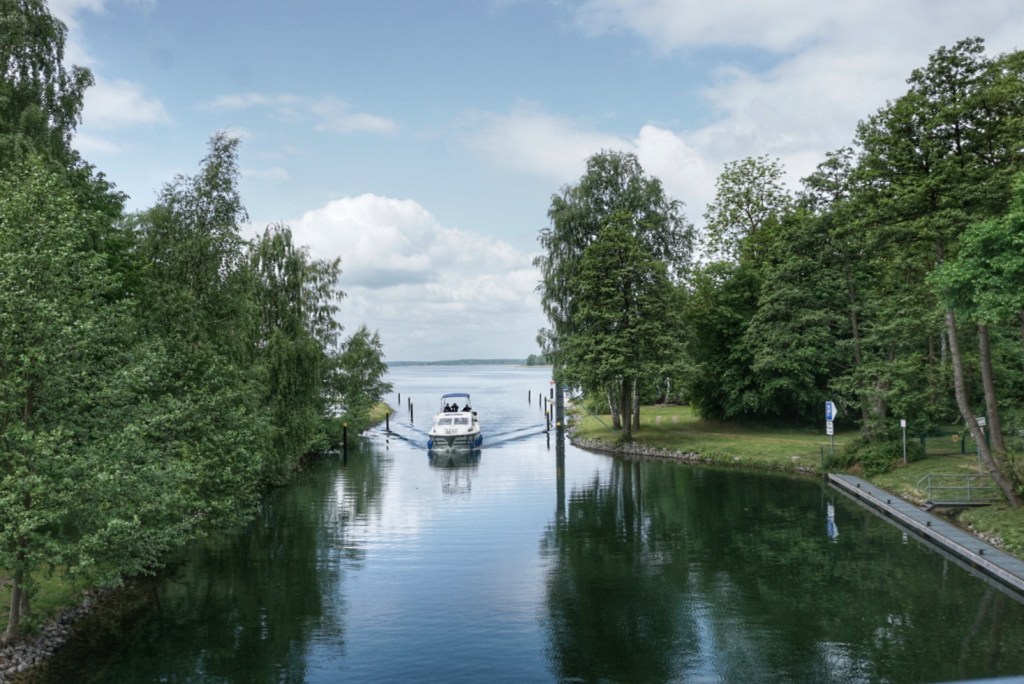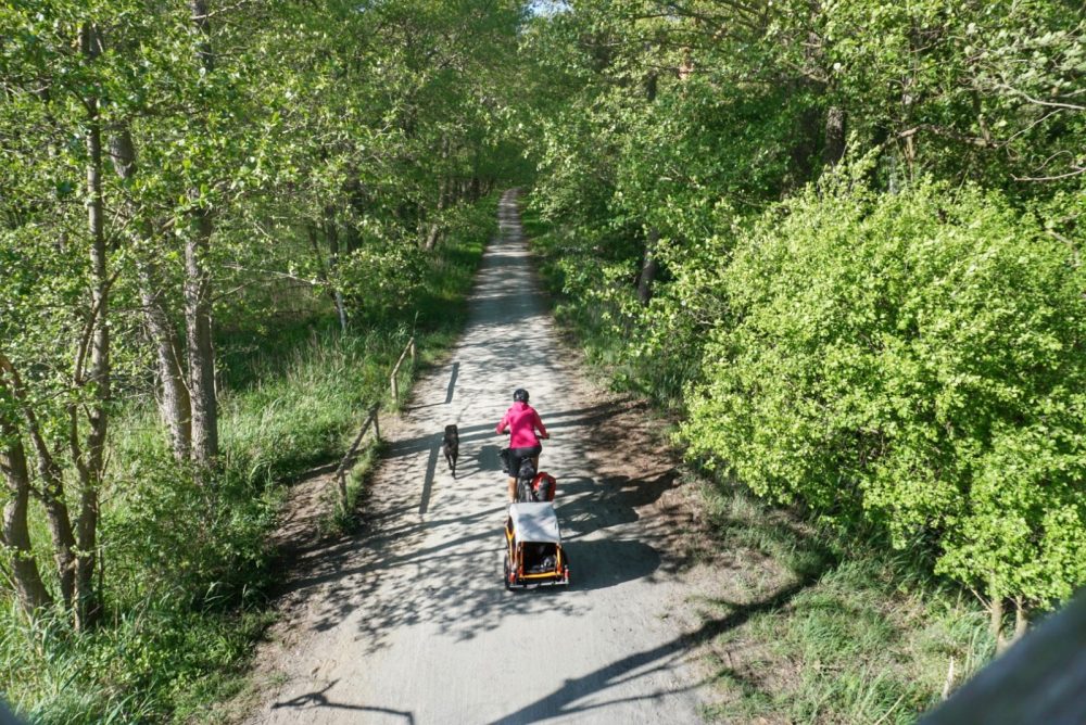 Napoli läuft viel. Unter den Laubdächern ist es herrlich schattig ohne duster zu sein und der samtige Boden bereitet ihm Spaß. Der Anhänger holpert problemlos hinten drein, denn die Waldwege sind nicht zu schmal und wenig wurzeldurchwachsen. Gelegentlich kreuzen andere Radler unseren Weg, vereinzelte Kanus gleiten durch’s Wasser. Es muss toll sein, die Landschaft aus dieser Perspektive zu betrachten und über Kanäle von See zu See zu wandern. Wir kommen kaum voran weil die Kamera im Dauereinsatz ist. Mensch, ist das klasse hier. Wären nur nicht die Horden an Mücken, die uns anfallen, sobald wir stehen bleiben.