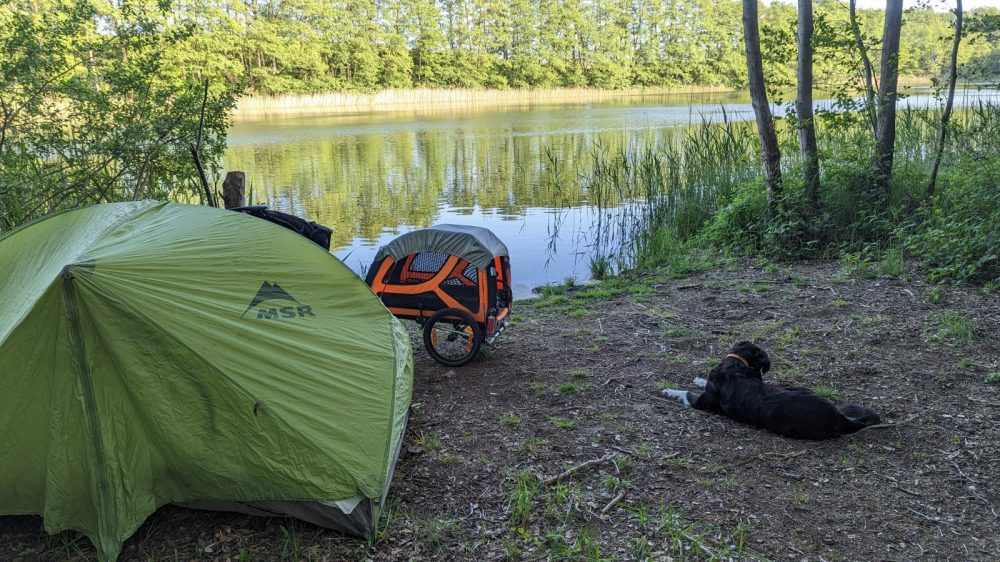 Wir mussten die Tour in zwei Etappen aufteilen, denn 80 km sind Napoli etwas zu viel. Als bekennender Langschläfer und Genießer, der alle paar Meter für einen Ausblick oder ein Foto stoppt, macht mir das wenig aus. An einem kleinen See außerhalb des Nationalparks fand sich rasch ein Plätzchen und ganz schnell flüchteten wir vor den Mücken ins Zelt. Wirklich notwendig (und eigentlich auch unerlaubt) war es nicht, wild zu zelten. Denn rund um den See finden sich viele bezauberne Campingplätze direkt am Wasser. Bemerkenswert fand ich, dass der Radweg jeweils durch die Plätze führte, was für den Radler sehr schön ist, bleibt er doch immer dicht am Ufer.