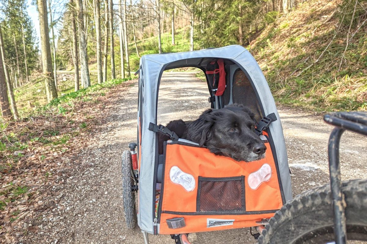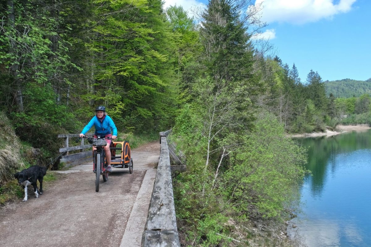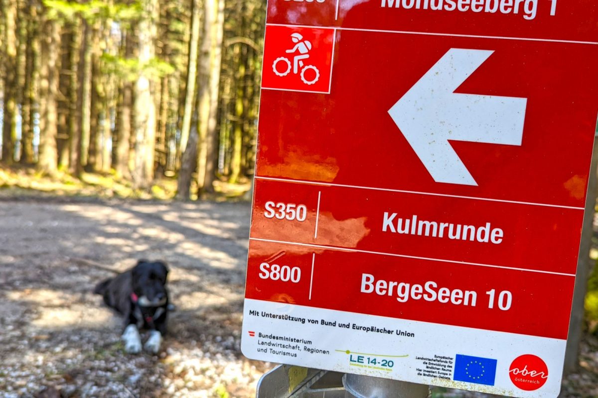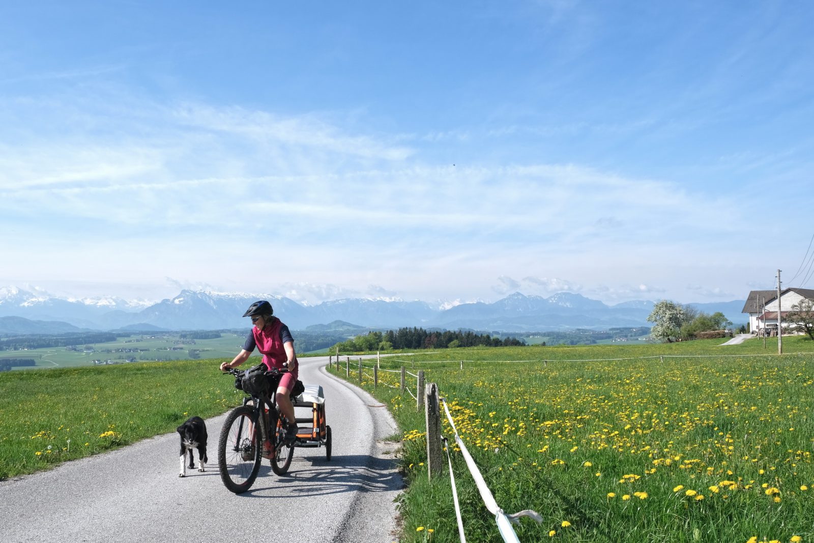 Seit ein paar Jahren ist die Gegend unweit von Salzburg meine Wahlheimat und so kam es, dass ich auf den BergeSeen eTrail aufmerksam wurde. Denn außerhalb der Region ist diese Radrunde noch nicht sehr bekannt, wie mir scheint. Gut beschildert schlängelt sich die Route durch die Voralpen, vorbei an den vielen Seen des Salzburger Landes und – zu einem sehr großen Teil auf Forstwegen. Für eine Radreise mit Hund die idealste Voraussetzung überhaupt. Über lange Strecken kann der tierische Begleiter hier ungehemmt laufen, ohne Konflikte mit anderen Radfahrern, wie das auf Rad(fern)wegen häufig der Fall ist.