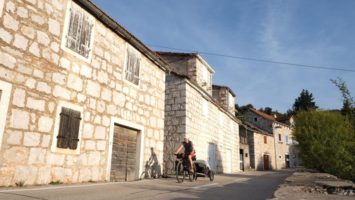 An diesem Tag sollte mir meine Spontanität ein Schnippchen schlagen. Nach dem langen Aufstieg waren unsere Wasserreserven aufgebraucht und weil nirgends Nachschub zu organisieren war, radelte ich weiter bis Bol. Von weitem sah ich dort einen hübschen Strand und richtete mich gedanklich darauf für die Nacht ein. Doch dann entpuppte sich der Ort als das reinste Touristennest. Also schnell Vorräte auffüllen und nichts wie weg obwohl es bereits Abend war. Die Straße führte bergauf und selten lässt sich an einer passartigen Straße ein geeigneter Platz für’s Zelt finden. Zudem musste sich unbedingt noch ein Plattfuss hinzu gesellen, den ich nicht so rasch beheben konnte. So dämmerte es und wurde verdammt dunkel. Die Straße war zwar wenig befahren und ich hatte Licht dabei, doch wirklich wohl war mir nicht. Napoli, in seinem Anhänger, hielt erfreulich still. Sehr spät konnten wir uns endlich auf steinigem Untergrund unser Nachtlager herrichten.