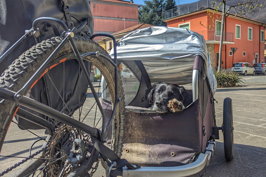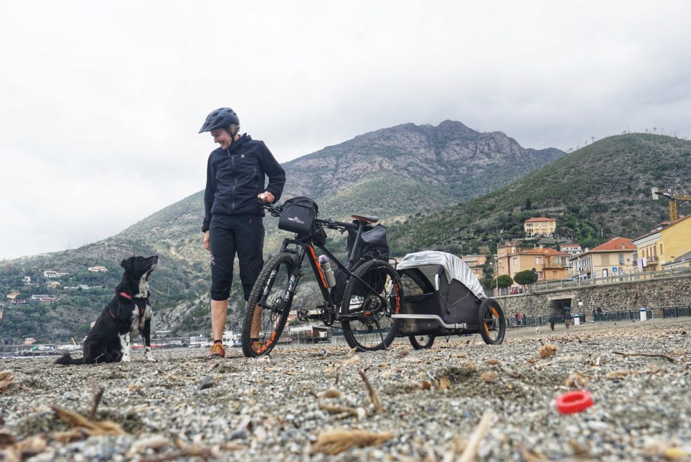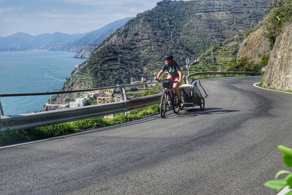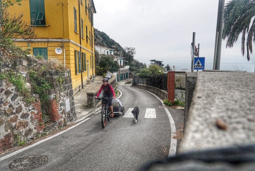 Als Anreise empfehle ich jedem die Autobahn von Parma nach La Spezia. Weil es April und damit Vorsaison ist, beginne ich unsere Reise mit den Cinque Terre, die sich von hier aus gen Norden leicht erreichen lassen. Ich weiß, dass die hübschen Küstenorte mit dem Auto kompliziert anzufahren sind, also bleibt der Campingbus im Hinterland und ich packe meinen vierbeinigen Begleiter in den Fahrradanhänger. Volltreffer!