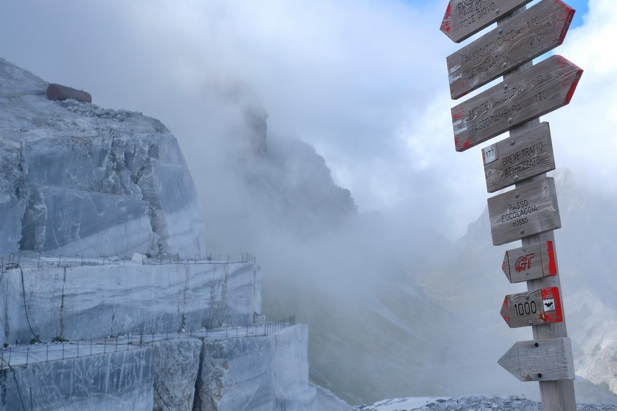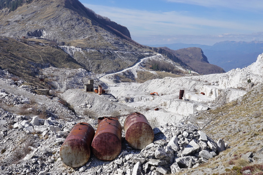 Mit schroffen Felsnadeln sind die Apuanischen Alpen ein ernst zu nehmendes Gebirge, wenn auch keiner ihrer Gipfel 2.000 Meter überragt. Als Teil des Apennin, erheben sie sich unmittelbar hinter der Küstenlinie und Meerblick vom Gipfel ist keine Seltenheit. Die Besonderheit dieser Region liegt im Marmor, der hier seit Jahrhunderten abgebaut wird, was das Landschaftsbild kontinuierlich verändert. Wanderungen auf bestens beschilderten Wegen sind begleitet von Signaltönen der Baumaschinen. An riesigen Wänden aus weißem Marmor vorbei zu schreiten ist bizarr. Erst auf weitere Distanz lässt sich erkennen, dass manche Berge nur noch aus einem Rumpf bestehen. Auf Wänden verlassener Betriebshäuschen sind Parolen wie „No Cave“ zu lesen, was so viel bedeutet wie „keine Marmorbrüche“. LKWs transportieren tonnenschwere Quader ab und bleiben gelegentlich in den engen Kurven der Bergsträßchen stecken. Dann gibt es für lange Zeit kein vor und zurück der Kolosse und die wartenden Autofahrer vertreiben sich typisch italienisch die Langeweile: sie telefonieren.