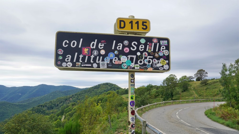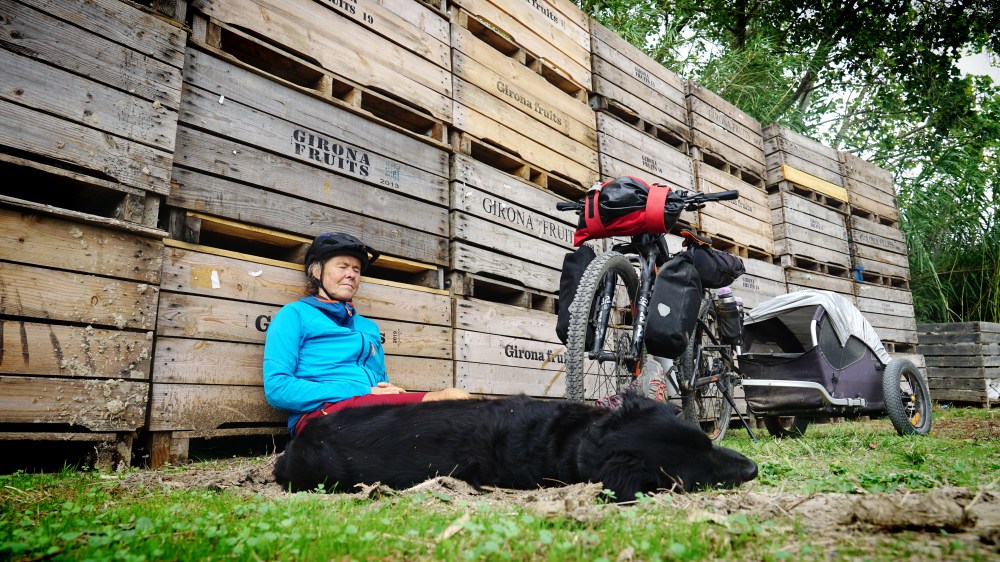 Zurück zu Tag zwei. Am Morgen baue ich flux das Zelt ab und nur Napoli bekommt sein Frühstück. Ich gehe leer aus, denn Kochutensilien habe ich nicht im Gepäck. Mir reicht schon der Fahrradanhänger, der mit vierbeiniger Ladung etwa 30 kg wiegt. Napoli darf laufen, während ich das letzte Stück zur Passhöhe des Col d‘Ares hinauf pedaliere. Wir überschreiten fast unmerklich die Grenze nach Spanien. Es ist menschenleer. Nur wir und die Weite der Pyrenäen. Für die Abfahrt ziehe ich mehrere Schichten Kleidung übereinander, nur an Handschuhe habe ich nicht gedacht. Also die Ärmel weit herunter ziehen, Hund in den Anhänger und abwärts geht’s.