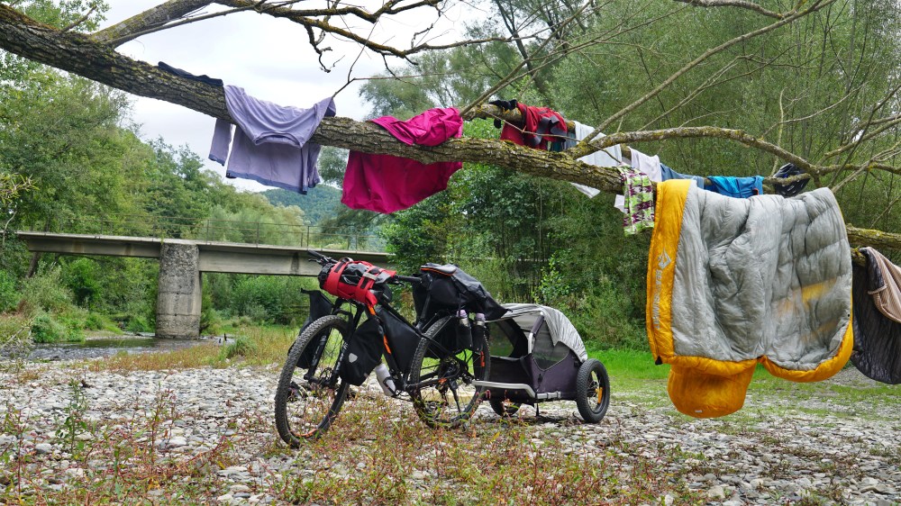Am Nachmittag rasten wir an einem Bach und ich verteile den gesamten Inhalt der Satteltaschen auf den Bäumen. Zelt und Schlafsack müssen dringend trocknen, sonst wird die kommende Nacht ungemütlich. Es dauert aber noch, bevor mir ein Fleckchen zusagt, an dem ich im letzten Tageslicht das Zelt aufstelle. Es ist kein sonderlich idyllischer Platz, doch zumindest sollten wir hier ungestört sein. Denke ich, bis uns am nächsten Morgen ein vorbeifahrendes Fahrzeug weckt.