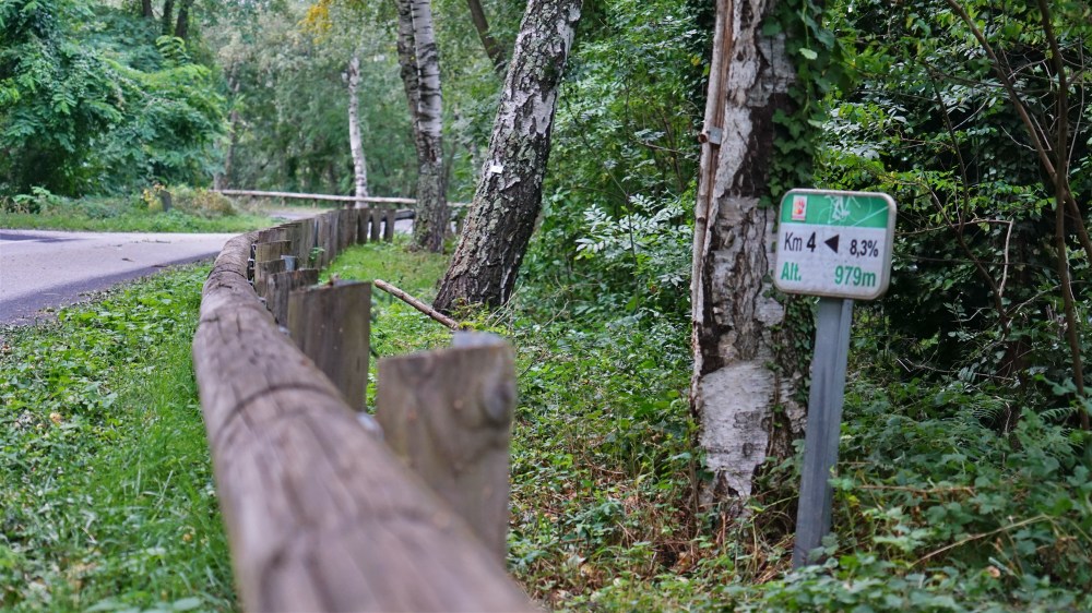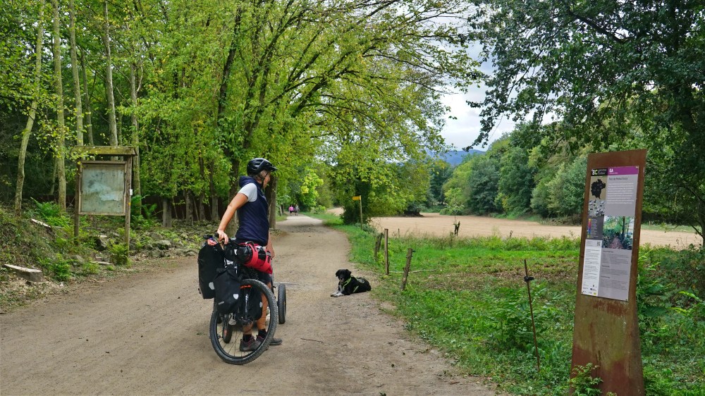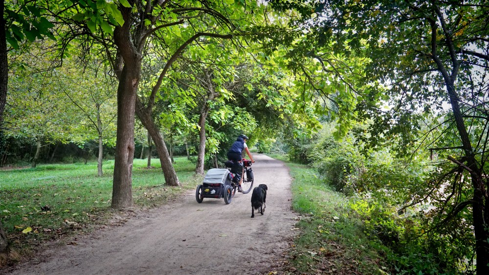 Die Radroute ist wunderbar ausgeschildert und über viele Kilometer verläuft sie abseits der Straße, so dass Napoli ungehemmt laufen – oder besser trödeln – kann. Wir kommen nur langsam voran weil Herr Hund Gerüche prüfen muss und hier und da sein Markenzeichen setzen. So ist es nun mal bei uns. Oft bleibe ich stehen und warte. Anleinen möchte ich ihn nicht, daran hätte er wenig Spaß. Er soll sich ausleben, denn später muss er für eine Weile in den Anhänger weil es im engeren Tal keinen separaten Radweg mehr gibt. Das Wetter ist so là-là, wie der Franzose sagt, die Dörfer sind ebenso unspektakulär wie die Landschaft. Abgesehen von diesem toll ausgebauten Radweg, auf dem wir kaum andere Radler treffen, bin ich zuächst mal gedämpft begeistert.