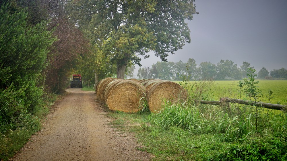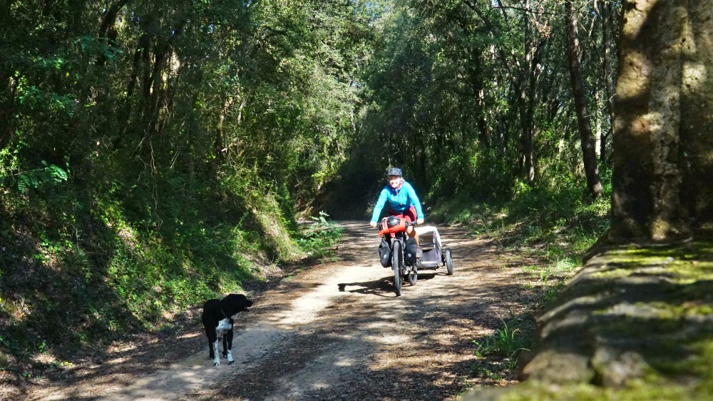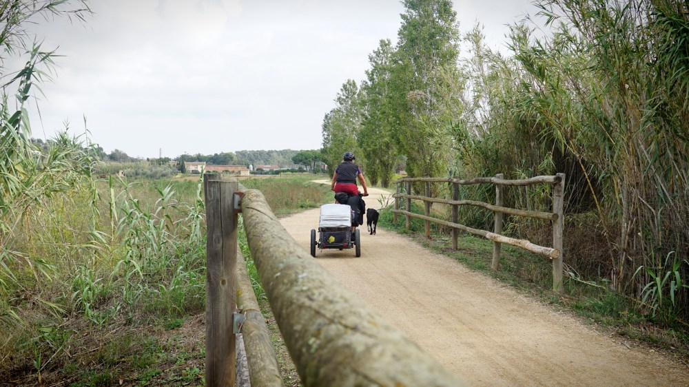 Bislang hat das Wetter gut gehalten. Nur am letzten Tag unserer Radrundreise erwischt uns noch etwas Regen. Wir haben die dicht besiedelte spanische Küste wieder glücklich verlassen als uns die ersten Tropfen einnässen. Gut, dass Napoli hier wieder bedenkenlos laufen kann, denn bei Regen sitzt er ungern im Anhänger. Vorbei an landwirtschaftlich genutzten Flächen, die sich stimmungsvoll im Nebel verstecken, visieren wir die Grenze zu Frankreich an.