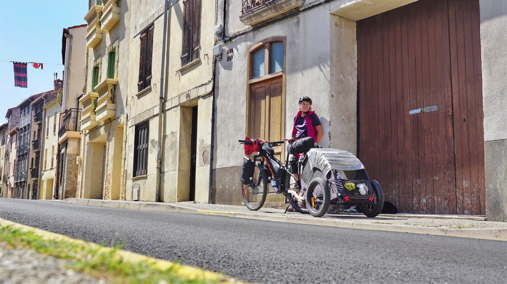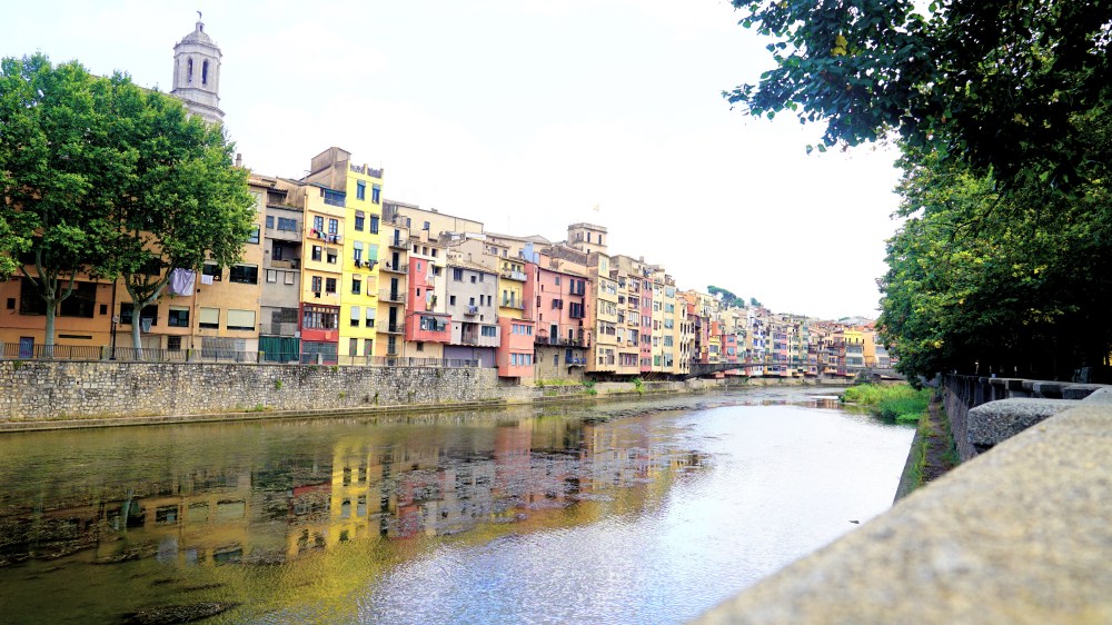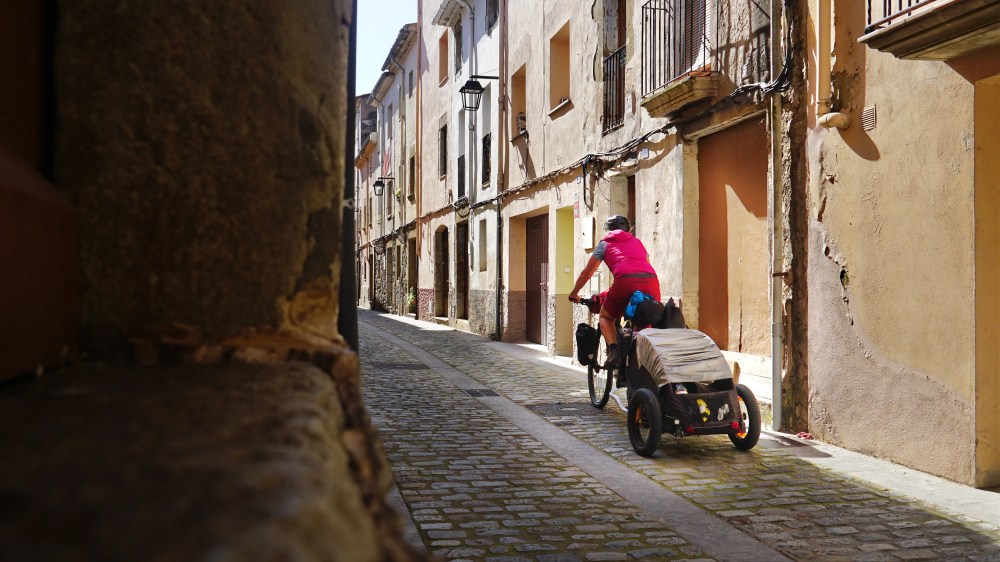 Selbst die Einfahrt nach Girona mit immerhin 100.000 Einwohnern, wurde so geschickt angelegt, dass Verkehrsstraßen bis fast zum Stadtzentrum völlig gemieden werden. Dort allerdings wird es fummelig und die gewohnten Wegweiser sind nicht zu finden. Einbahnstraßen erschweren das Vorankommen, viele Passanten machen das Schieben des langen Gespanns auf dem Bürgersteig kompliziert. Aber Girona’s Stadtkern ist hübsch mit seinen bunten Häusern entlang des Flusses. Das entschädigt.