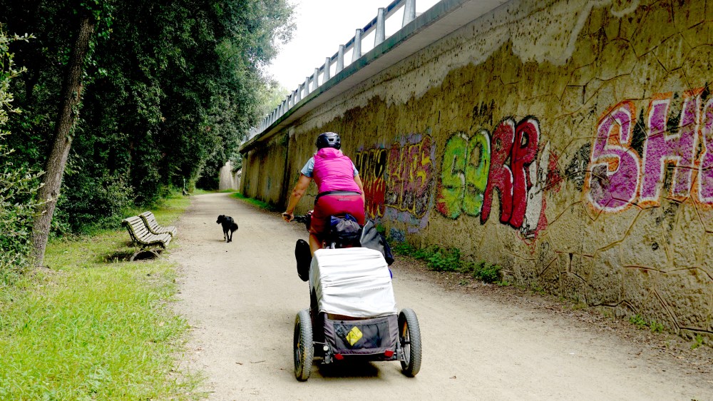 Erst am Fuß des Passes erreichen wir einen Ort mit kleinem Lebensmittelladen und ich verspeise mein spätes Frühstück auf den Stufen davor. Dann geht es weiter und der Radweg gefällt mir mehr und mehr. Lange Sequenzen verlaufen auf Naturpiste. Durch Ortschaften leitet die Beschilderung immer abseits der Hauptstraße. Wir treffen ein radreisendes Paar, sonst kaum jemand auf zwei Rädern. Napoli kann wieder nach Herzenslust kreuz und quer laufen.